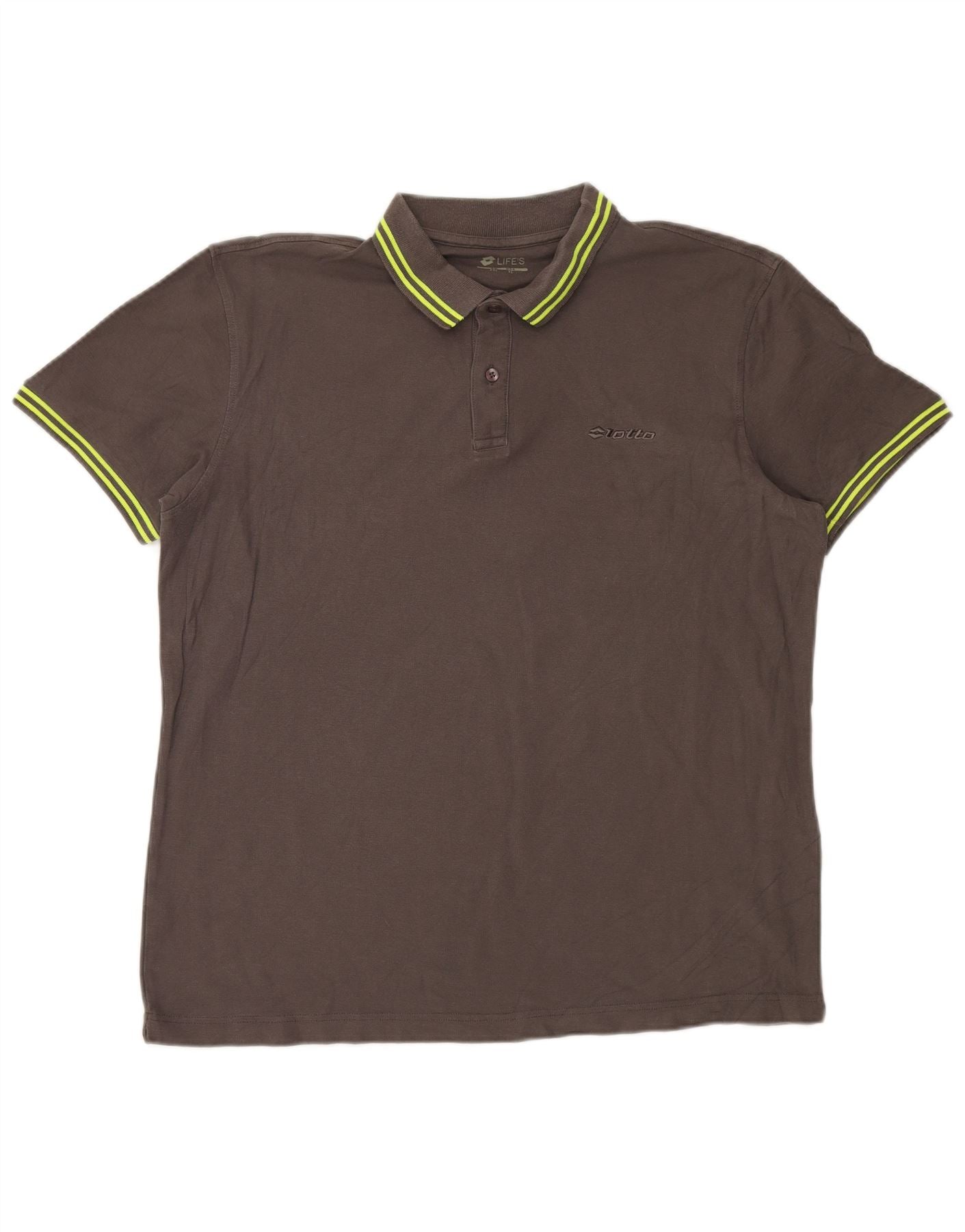 - Descrição da IA: Esta camisa pólo feminina da Lotto é confeccionada em um confortável tecido de malha marrom. Possui decote clássico com gola e carcela de três botões. Mangas curtas e corte regular garantem facilidade de movimento. Listras amarelas neon acentuam a gola e os punhos das mangas, adicionando um toque vibrante. Um logotipo bordado sutil aparece no peito. Projetado para conforto e respirabilidade, é ideal para esportes ou uso casual.