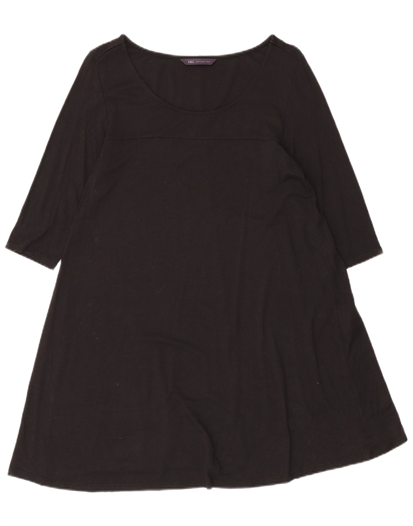 - Descrição da IA: Este vestido feminino da Marks & Spencer é feito de uma mistura suave de viscose preta com elasticidade adicional. Possui decote redondo clássico e mangas 3/4 confortáveis. O corte descontraído e solto cai graciosamente, criando uma silhueta lisonjeira em linha A. Este estilo pulôver oferece uso fácil e estilo versátil para qualquer ocasião.