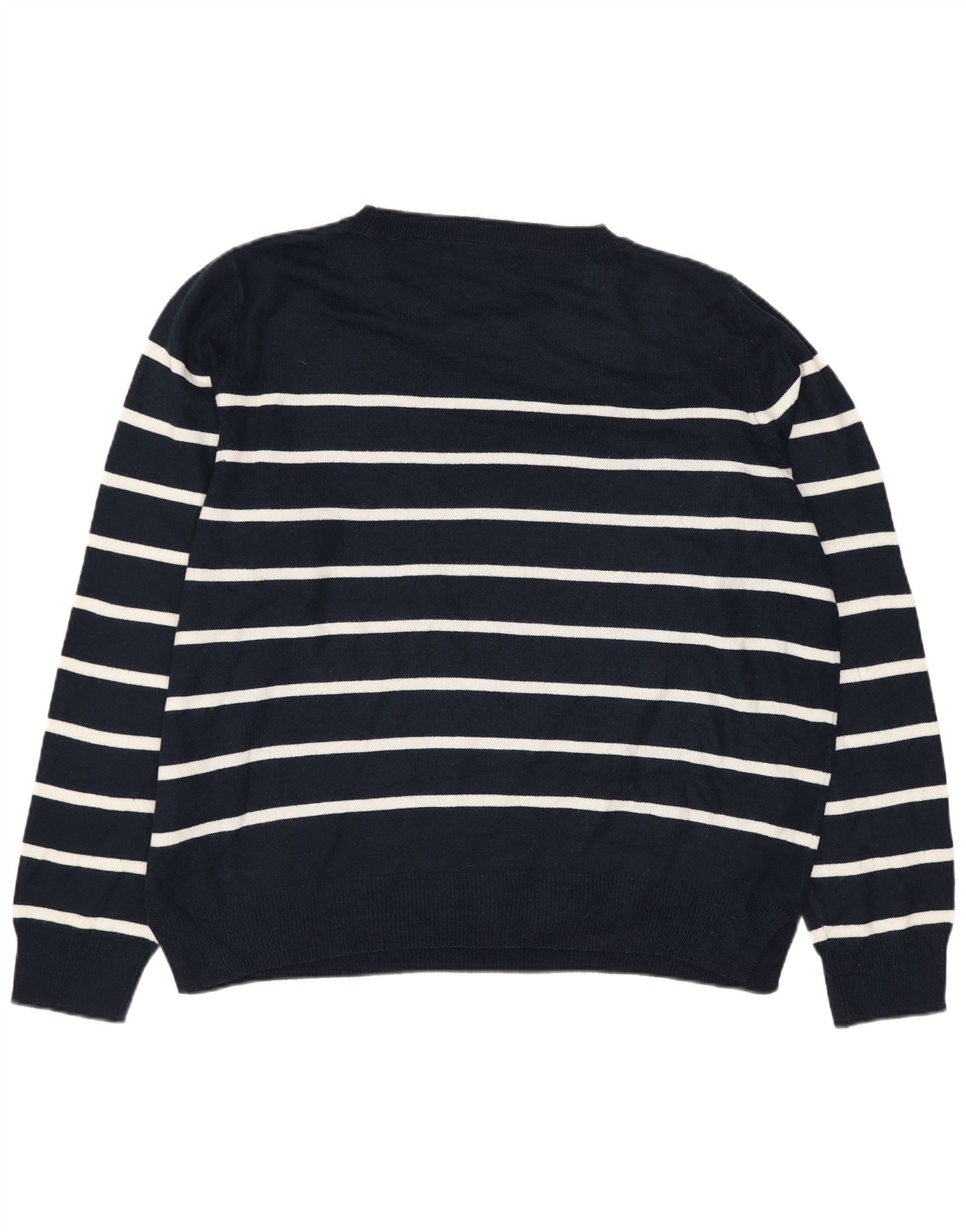 - Descrição da IA: Este suéter feminino com gola redonda da Marks Spencer é feito de malha macia 100% algodão. Possui uma base clássica em azul marinho com listras horizontais brancas, criando um visual náutico atemporal. O decote redondo e as mangas compridas oferecem um ajuste confortável e regular. Este design de pulôver é leve e oferece estilo fácil para uso diário.