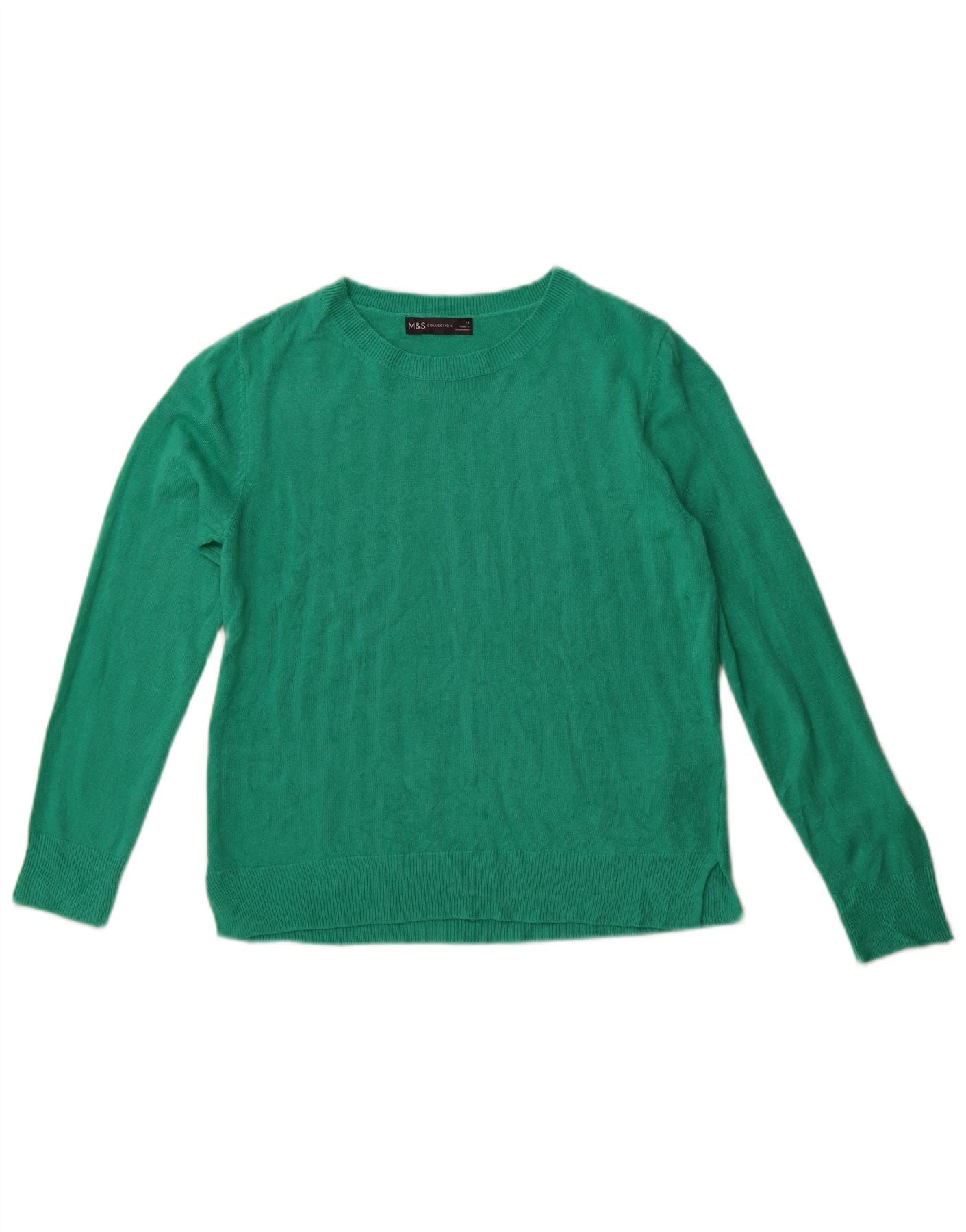 - AI Description: This Marks & Spencer womens crew neck jumper sweater is crafted from soft acrylic knit, offering a comfortable feel. It comes in a vibrant green hue. The classic round neckline and long sleeves provide a timeless silhouette. A regular fit ensures ease of wear. This pullover design is simple and versatile, perfect for everyday layering.