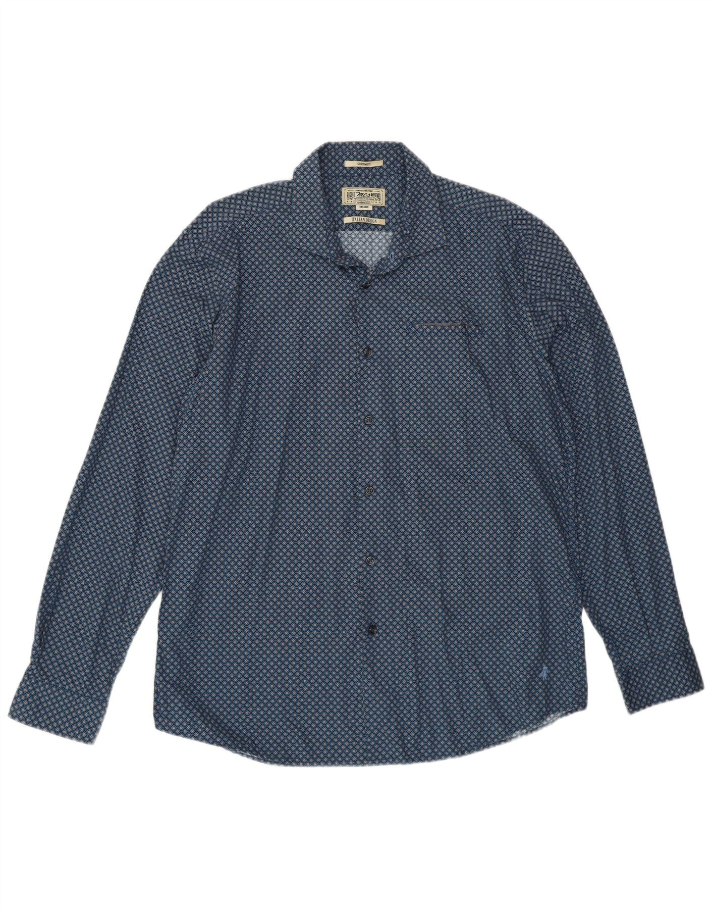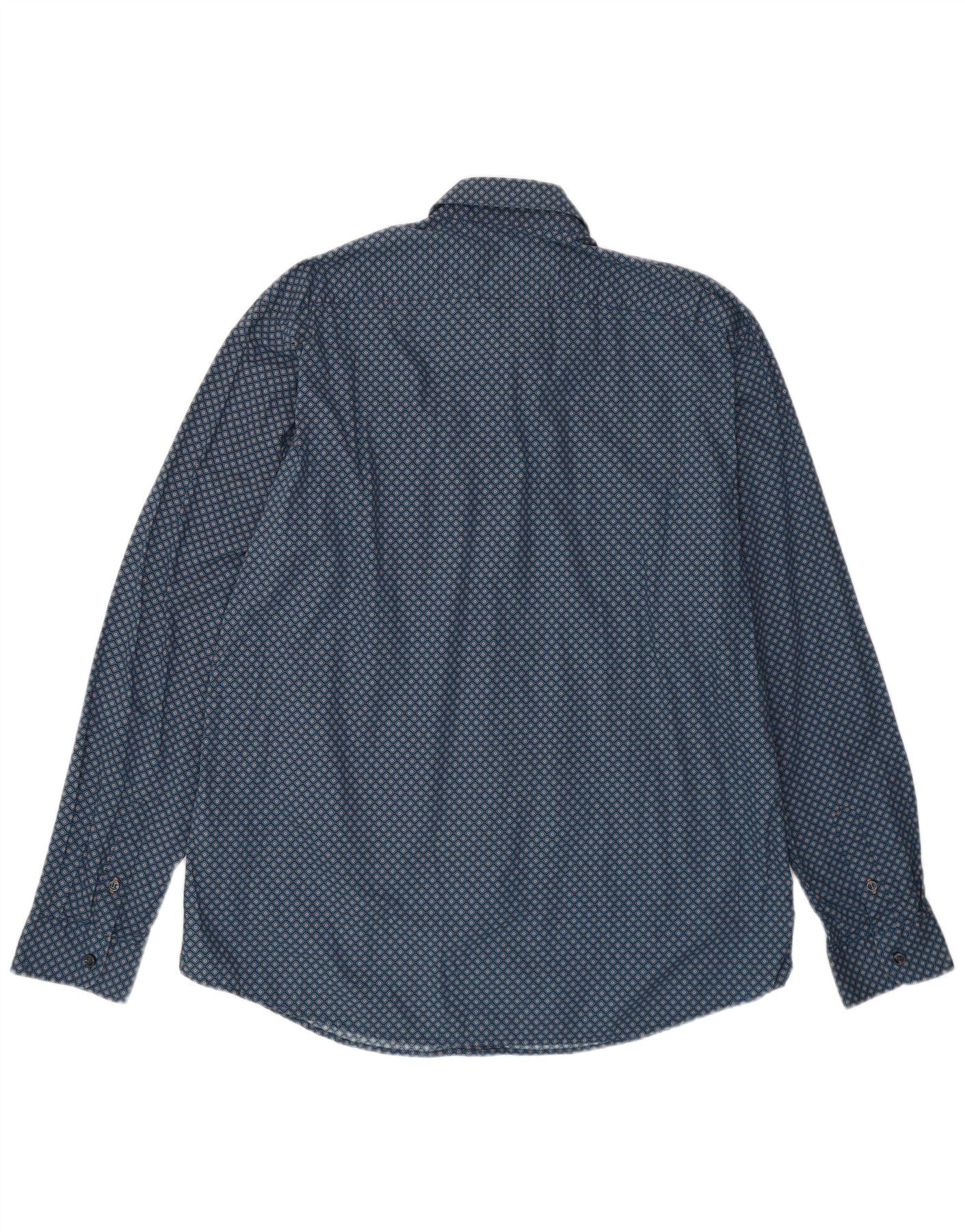 - Descrição da IA: Esta camisa masculina Marlboro Classics é confeccionada em tecido 100% algodão. Possui um padrão geométrico azul distinto por toda parte. O decote com gola e botões frontais completos oferecem um visual clássico e refinado. Mangas compridas com punhos abotoados completam a silhueta sob medida. Um único bolso no peito acrescenta detalhes práticos. Esta camisa de ajuste personalizado oferece um ajuste regular e confortável.