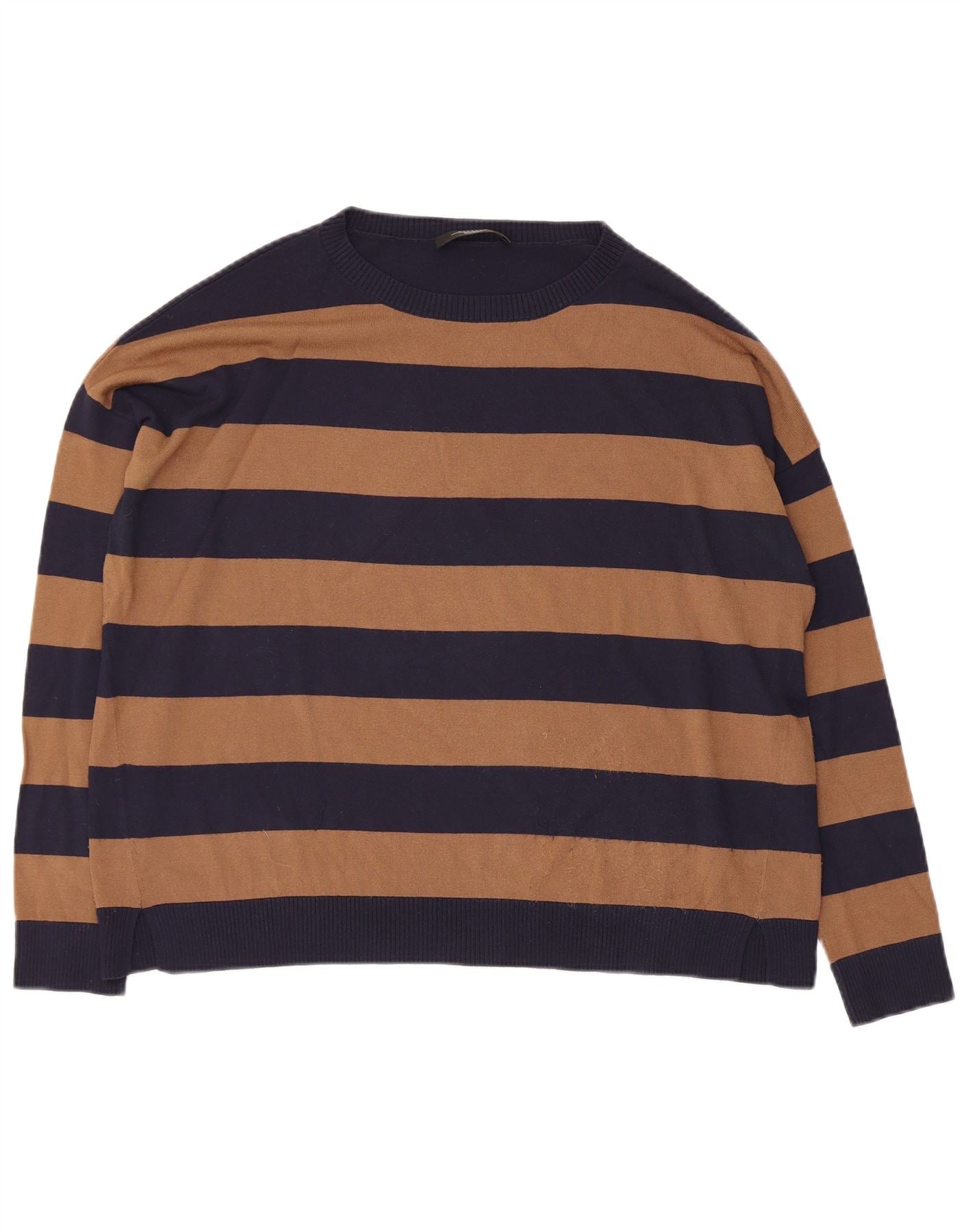 - Descrição da IA: Este suéter feminino Max Mara com gola redonda é confeccionado em uma mistura leve de malha de viscose que oferece conforto e toque macio. Apresenta um clássico padrão listrado em tons contrastantes de azul marinho e marrom. O decote redondo e as mangas compridas proporcionam uma silhueta atemporal. Projetado para um ajuste solto e descontraído, garante um uso sem esforço. Este estilo pulôver combina design clássico com conforto moderno.