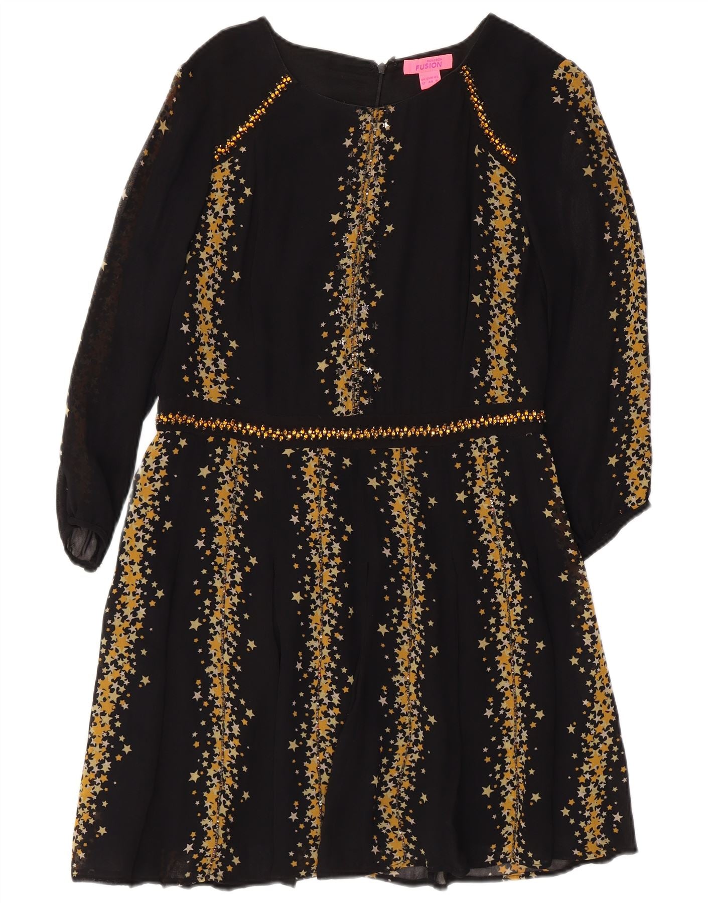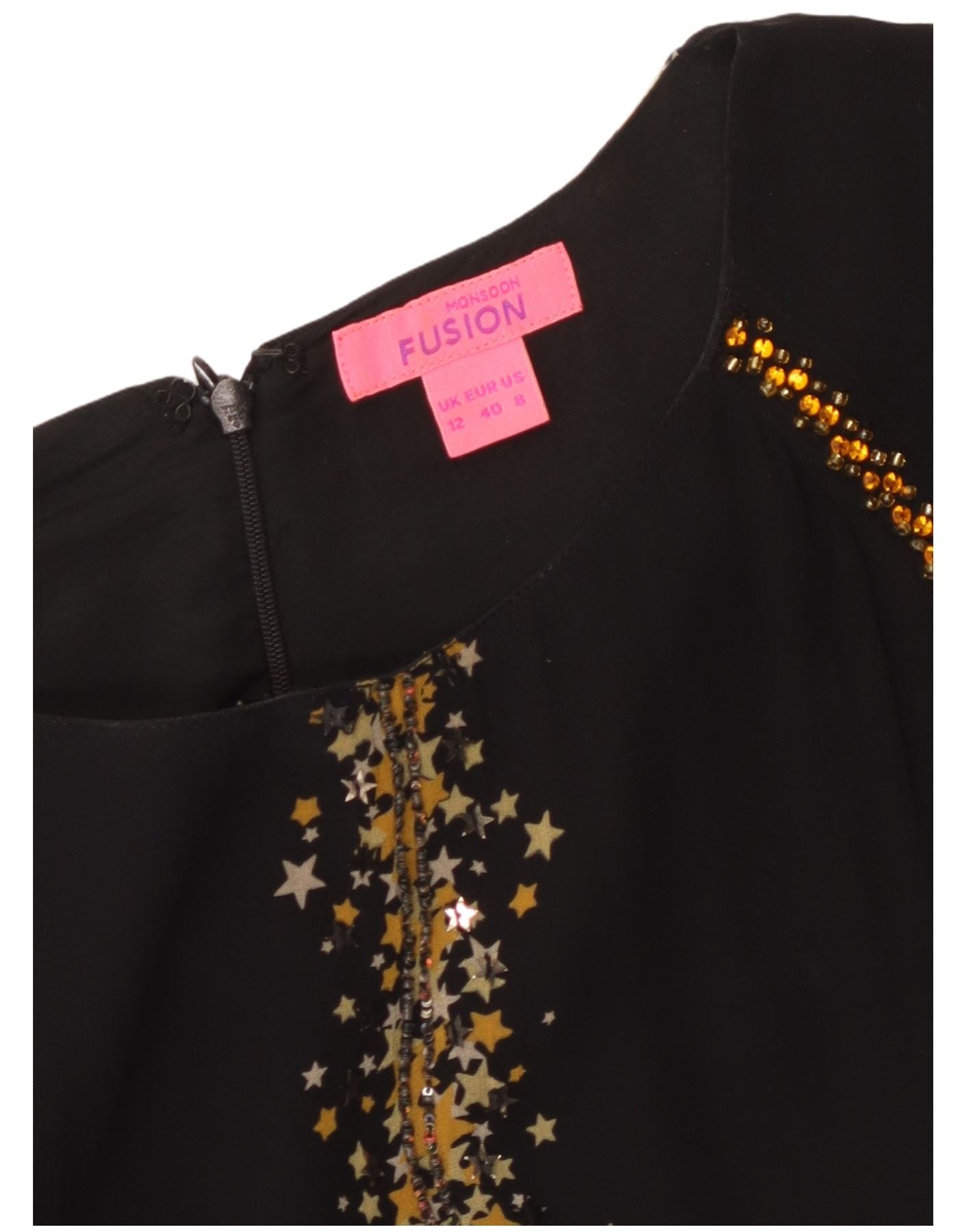 Vestido feminino MONSOON com padrão abstrato manga 3/4 linha A Reino Unido 12 médio preto