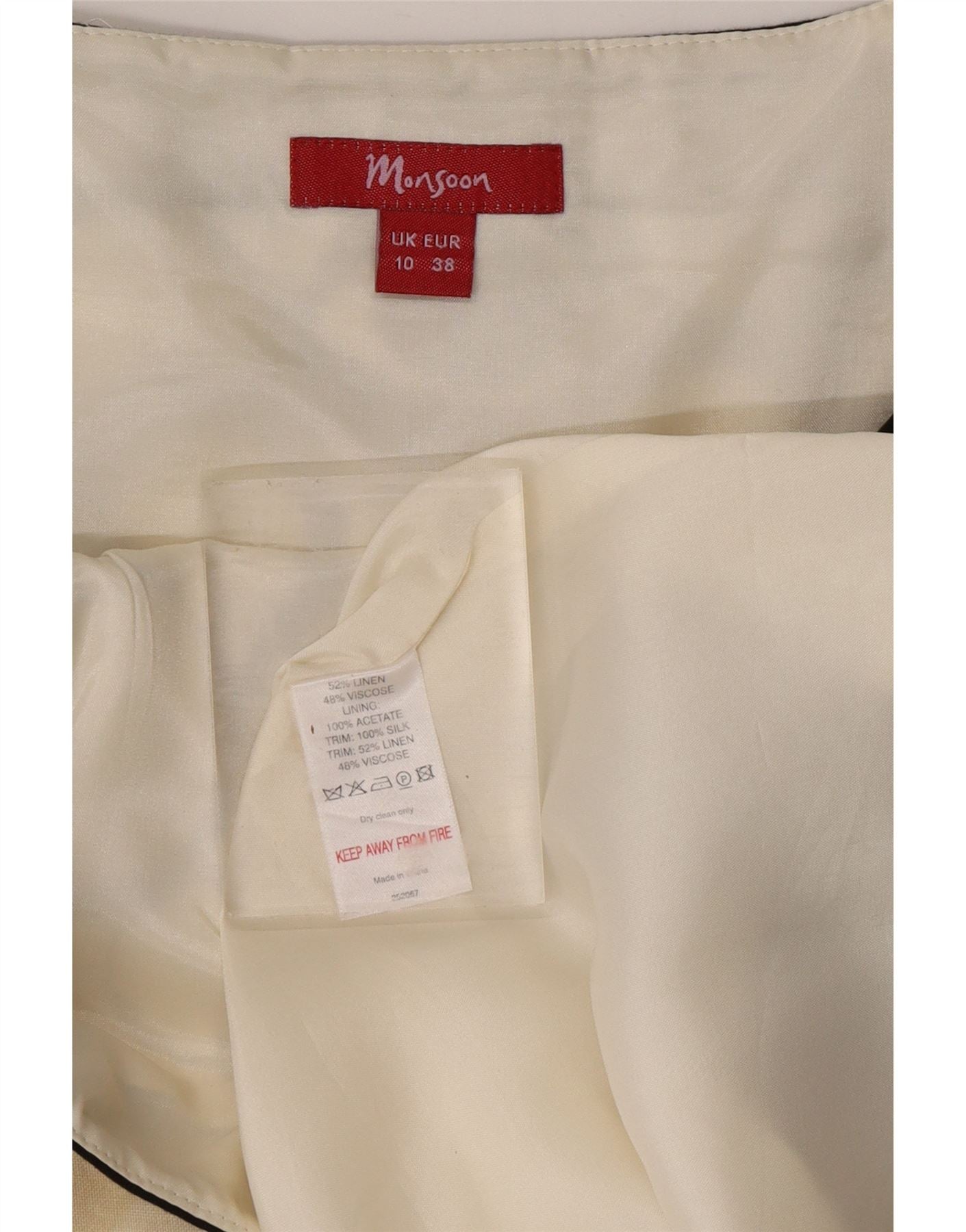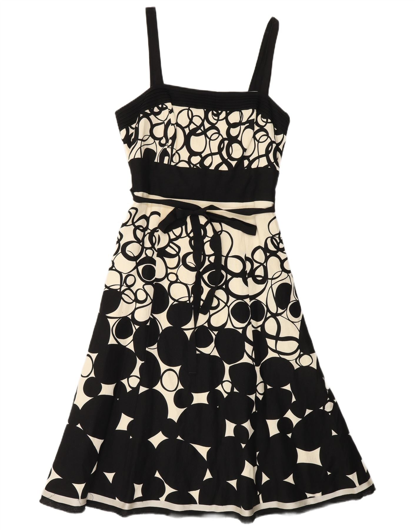 Vestido feminino MONSOON sem mangas evasê UK 10 pequeno linho geométrico preto