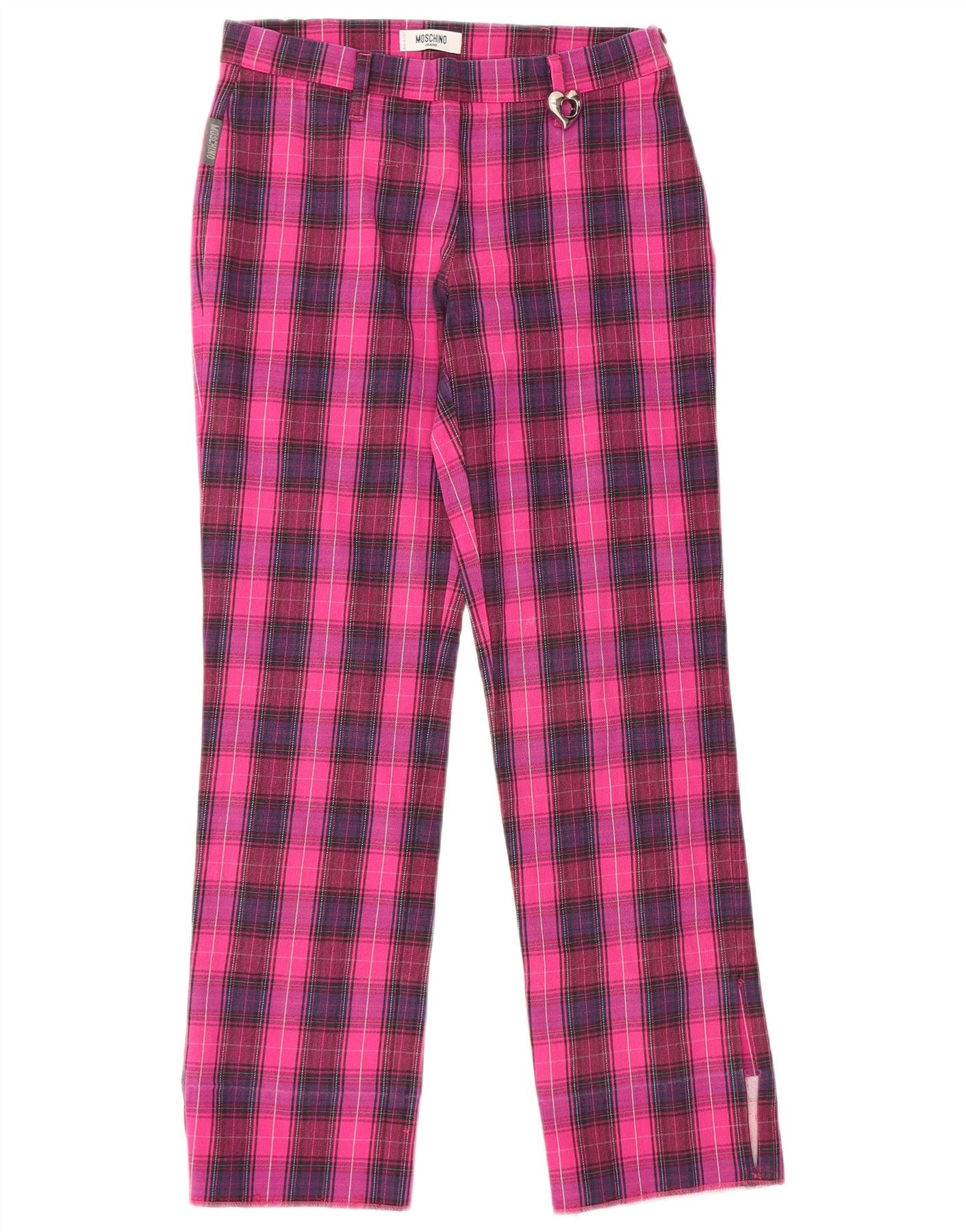 Calça feminina casual reta MOSCHINO Reino Unido 10 pequena W28 L28 rosa xadrez