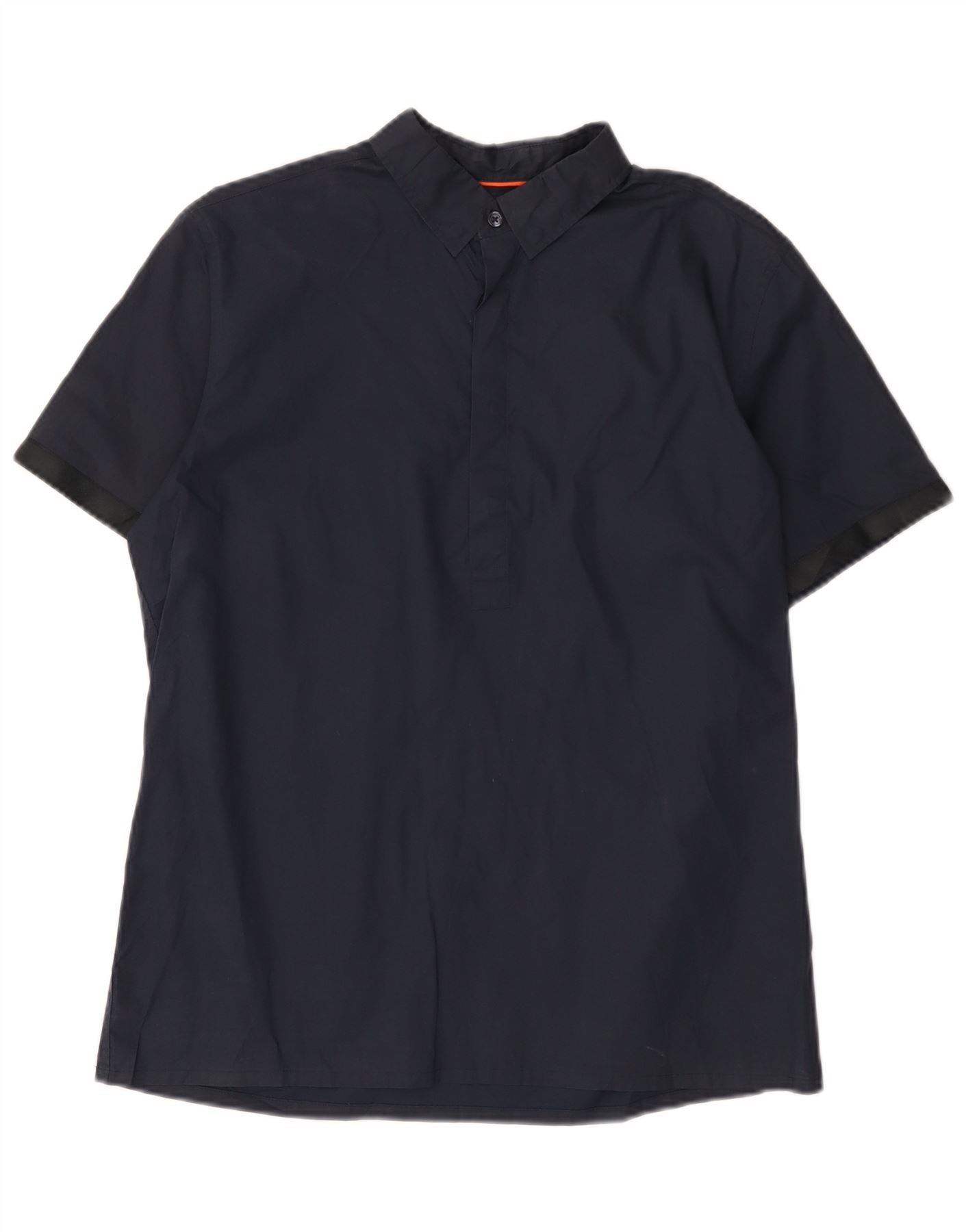 - Descrição da IA: Esta camiseta masculina Mossimo é confeccionada em 100% algodão tecido em um rico azul marinho. Possui decote com gola moderna e carcela parcial de botões. Mangas curtas e corte justo criam uma silhueta contemporânea. O design oferece uma aparência inteligente e confortável, perfeita para um estilo versátil.
