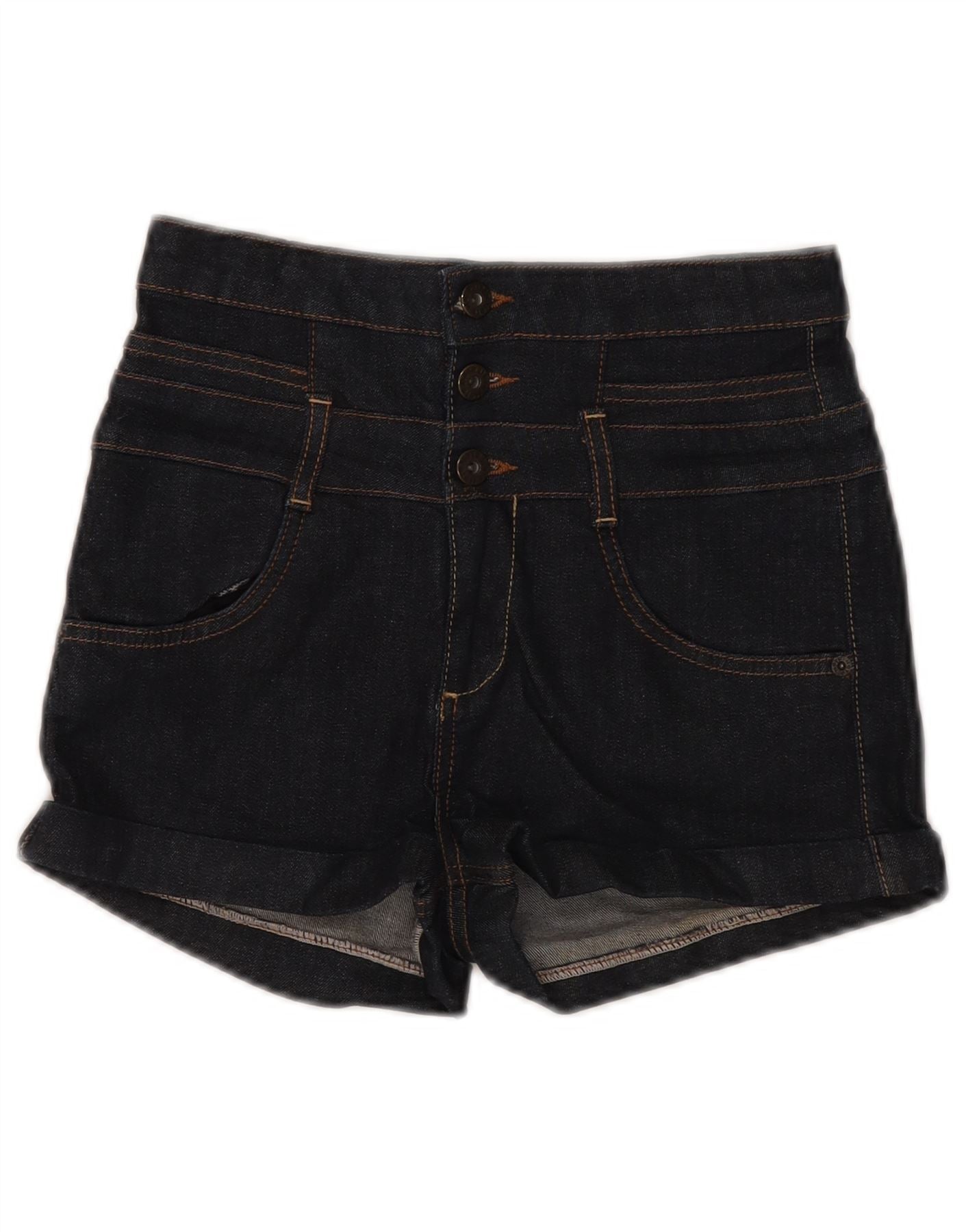 Shorts jeans feminino de cintura alta MOTO Reino Unido 10 pequeno W28 algodão azul marinho