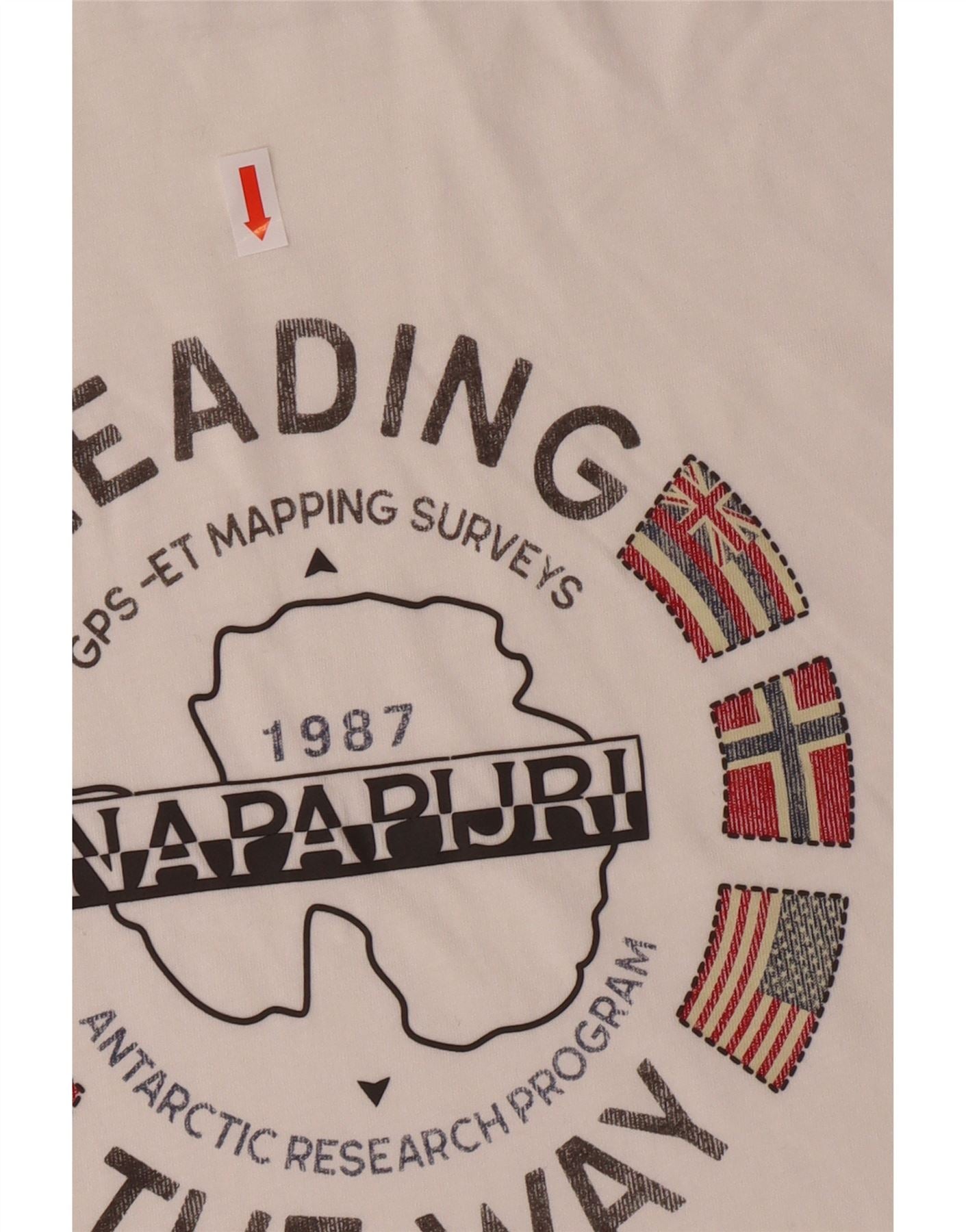 - Descrição da IA: Esta camiseta gráfica masculina Napapijri é confeccionada em malha macia de mistura de algodão off white. Possui gola redonda clássica e mangas curtas para conforto diário. O ajuste regular garante uma silhueta relaxada. Uma estampa gráfica distinta adorna a frente, mostrando o tema do Programa de Pesquisa Antártica da marca com bandeiras e texto. Este pulôver oferece desgaste leve e elasticidade para facilitar os movimentos.