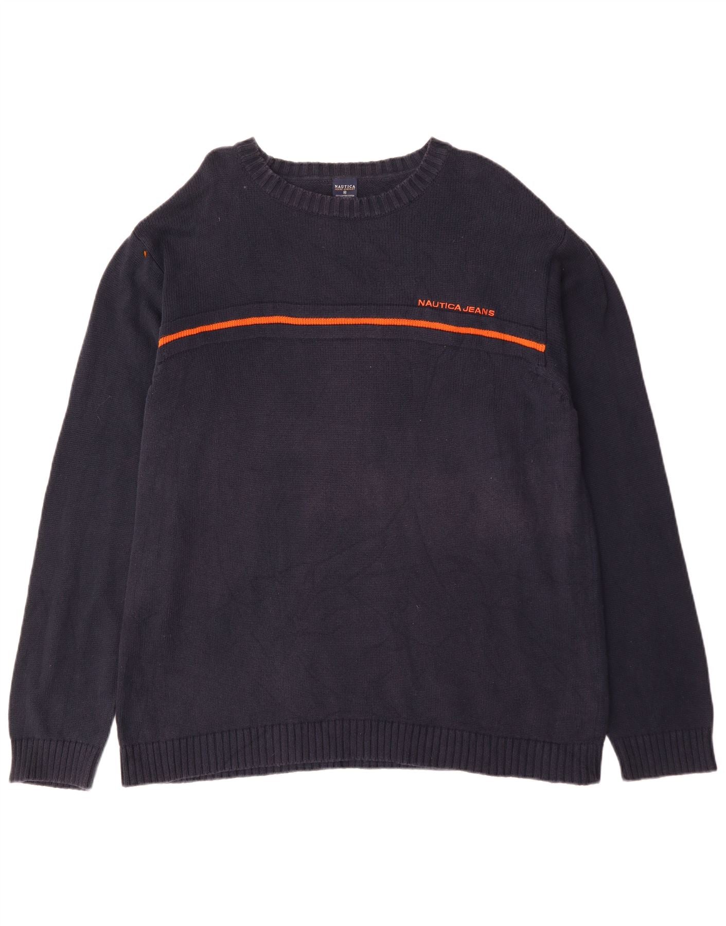 - AI Description: This Nautica mens crew neck jumper sweater is crafted from 100 percent cotton knit for a comfortable feel. It features a deep navy blue hue with a striking orange stripe across the chest. The Nautica Jeans logo is embroidered neatly on this stripe. A classic round neck and long sleeves define its structure. The relaxed fit ensures ease of wear and a casual silhouette. This pullover design offers timeless style and comfort.