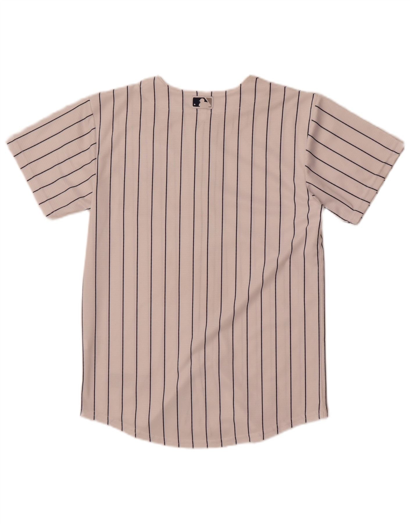 - Descrição da IA: Esta camiseta masculina da Nike é confeccionada com um tecido misto leve e respirável. Possui um clássico botão frontal e mangas curtas. O ajuste regular garante conforto e facilidade de movimento. O tecido branco é adornado com listras verticais e o icônico logotipo do New York Yankees no peito. Um logotipo sutil da Nike acrescenta reconhecimento à marca. Este top de estilo esportivo é perfeito para mostrar o apoio da equipe.
