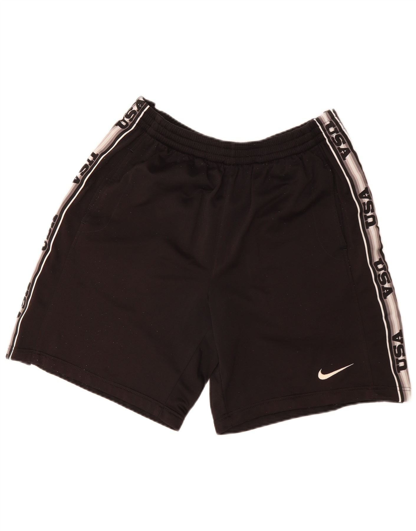 - Descrição da IA: Este short esportivo masculino da Nike é confeccionado em camisa de poliéster preta lisa. Eles apresentam um ajuste atlético regular com cintura elástica. Listras laterais com texto dos EUA e um logotipo da Nike adicionam marca distinta. Bolsos práticos melhoram a funcionalidade. O design oferece conforto e estilo para uso ativo.