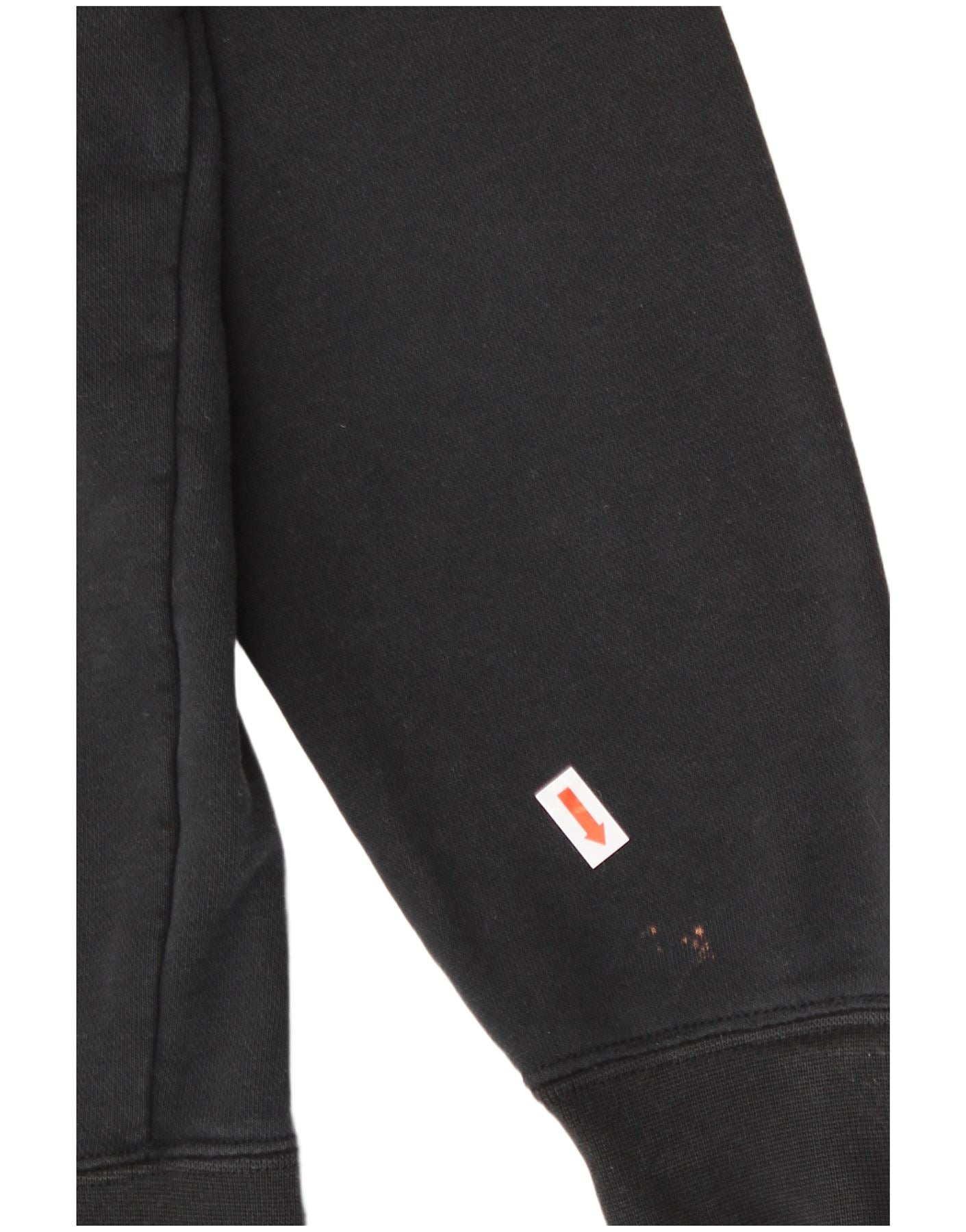 Condição de uso justo: o item foi usado com frequência e pode ter inúmeras falhas – Cor desbotada e marcas de ferro na manga esquerda, marcas de alvejante na manga direita.