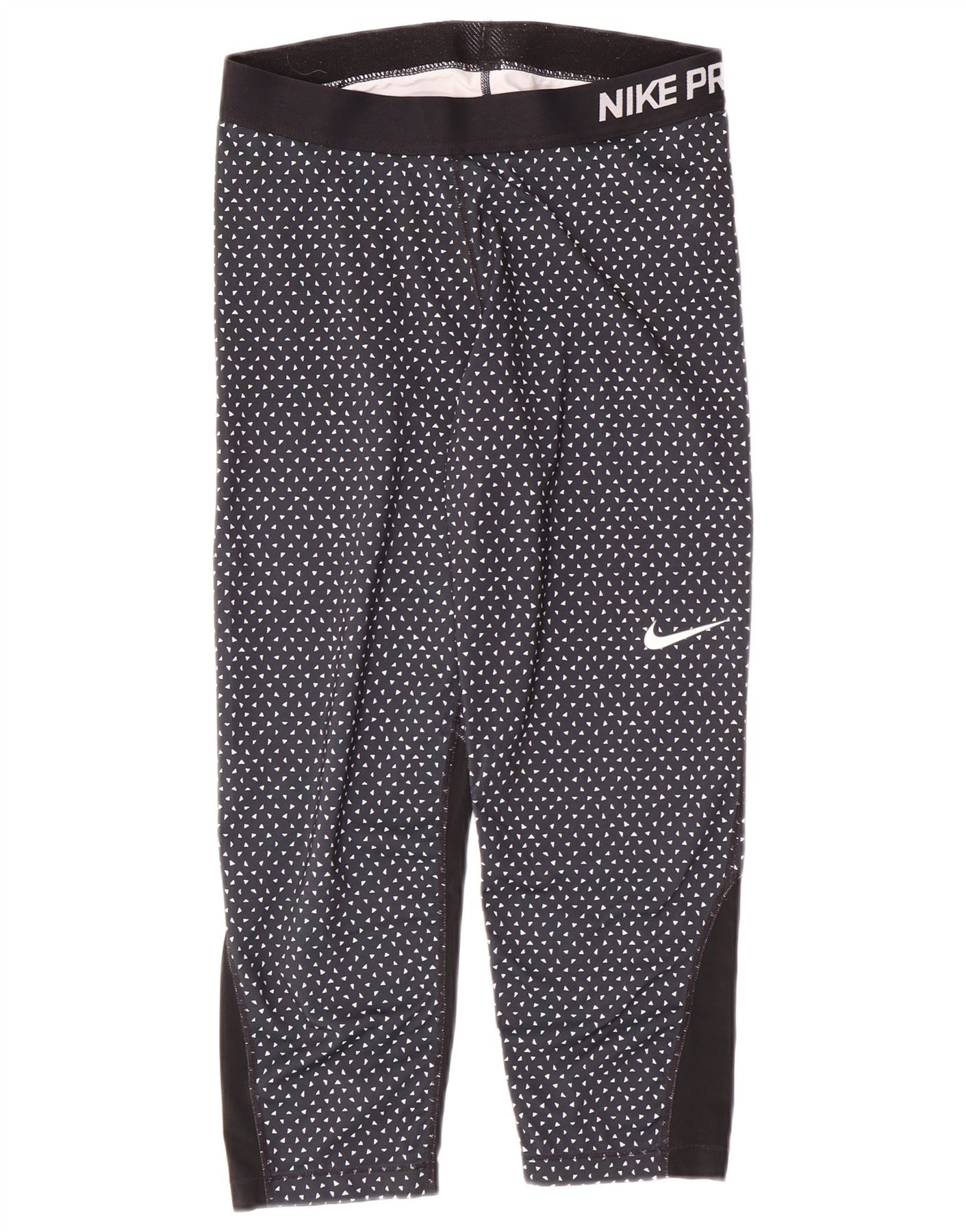 - Descrição da IA: Estas leggings de corrida femininas Nike Pro são feitas de uma mistura macia de poliéster e elastano. Eles apresentam um ajuste fino e um fecho pull-on para facilitar o uso. O tecido é respirável e elástico, projetado para desempenho. Um padrão manchado adiciona um detalhe gráfico ao tecido preto. Estas leggings capri são ideais para corrida e atividades esportivas.