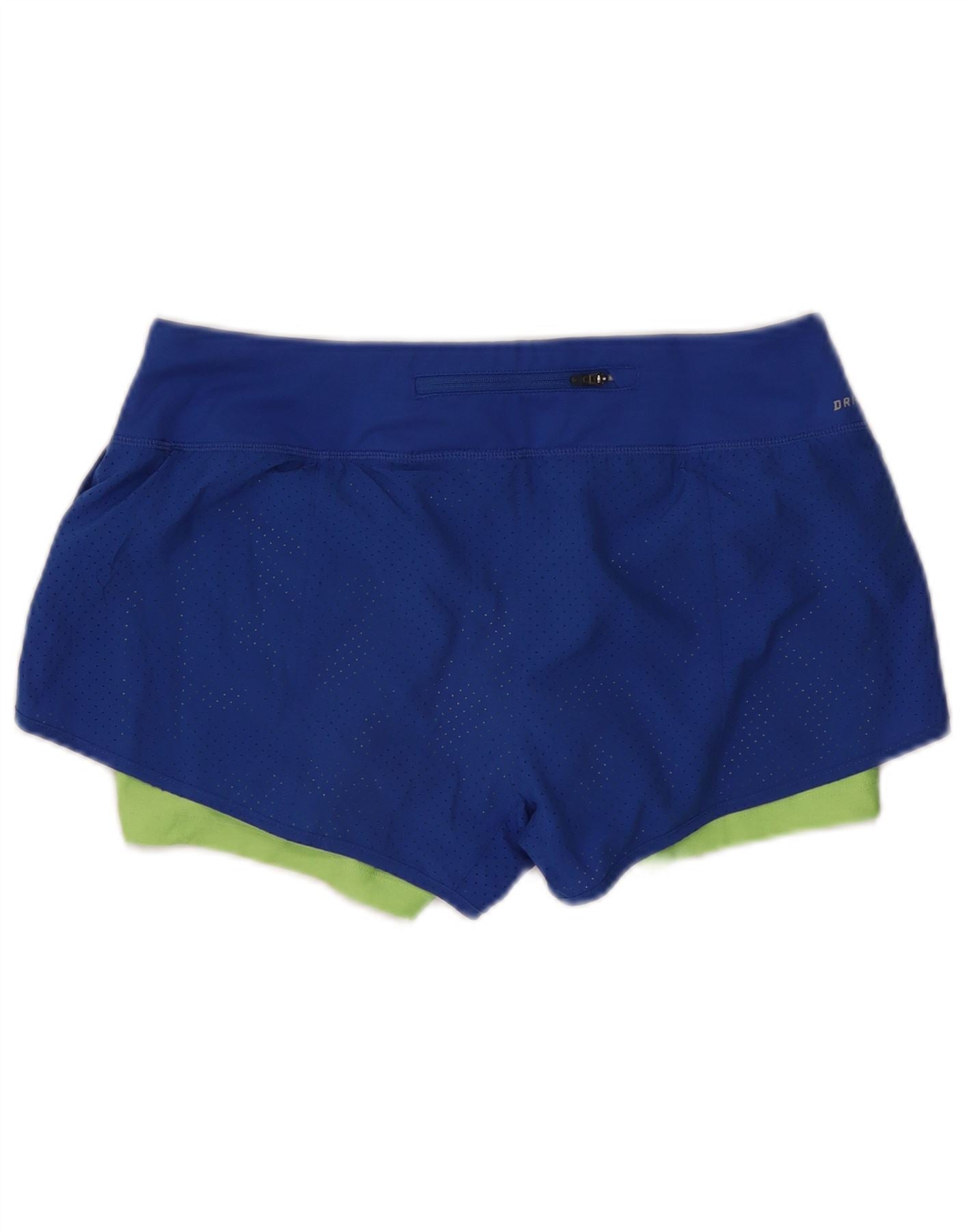 - Descrição da IA: Estes shorts de corrida femininos da Nike são confeccionados em tecido respirável com mistura de poliéster. A camada externa apresenta uma textura de malha. Eles oferecem um ajuste de conforto atlético com um cós elástico pull-on. O design inclui um forro interno para suporte. Uma camada externa em bloco de cores azul vibrante contrasta com uma camada interna verde limão. Bolsos com zíper proporcionam armazenamento prático. Um logotipo sutil da Nike completa o visual.