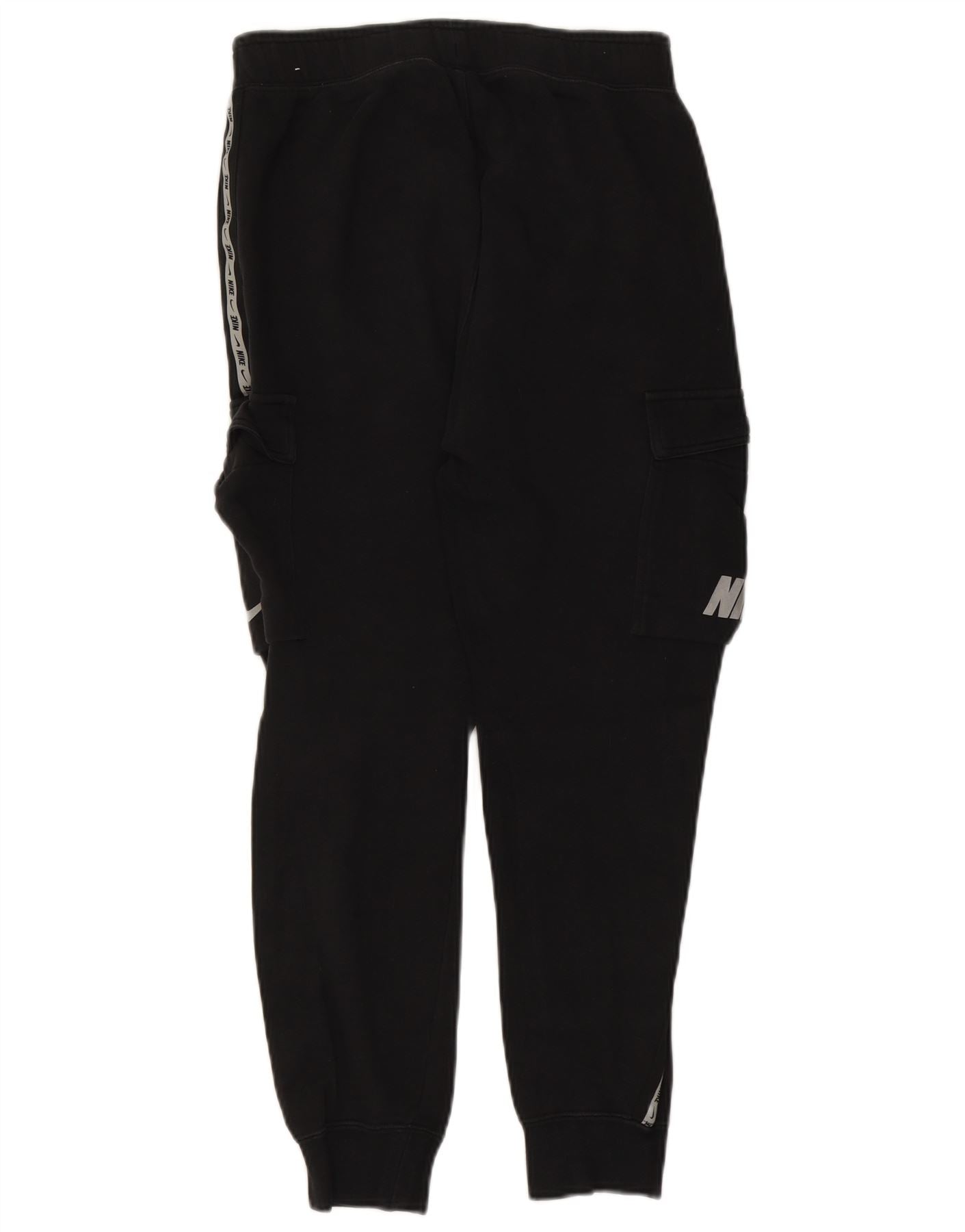 - Descrição da IA: Estas calças de treino masculinas da Nike são feitas de um confortável tecido de lã com mistura de algodão preto. Eles apresentam um ajuste regular com cintura elástica com cordão para ajuste. Bolsos cargo práticos adornam as laterais, ao lado dos tornozelos com punhos para um acabamento elegante. A fita do logotipo da marca percorre a parte externa da perna, adicionando um toque atlético distinto. Este estilo esportivo oferece conforto e funcionalidade.