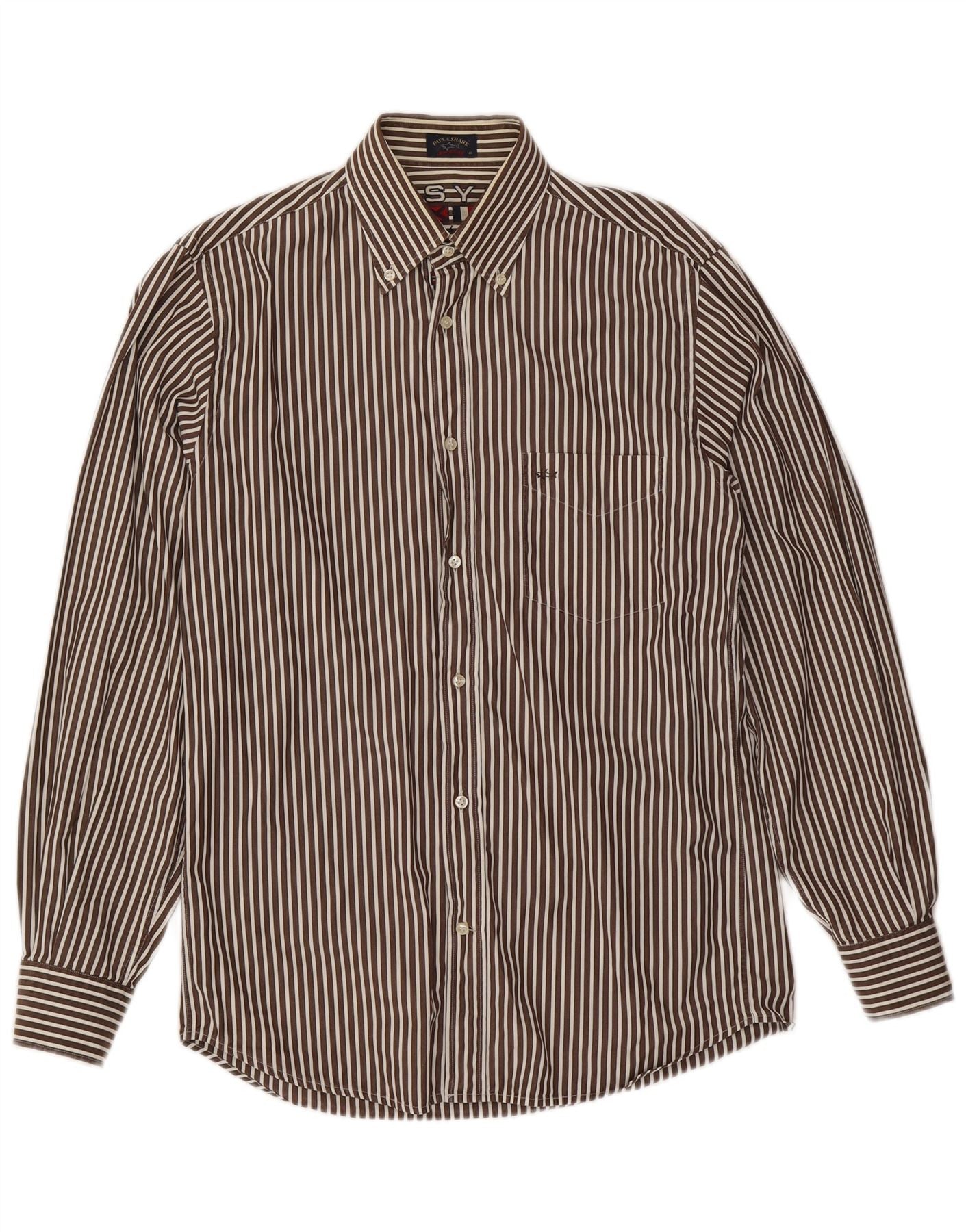 - Descrição da IA: Esta camisa masculina Paul & Shark é confeccionada em tecido com uma textura nítida. Ele apresenta um padrão clássico listrado marrom e branco. O decote com colarinho e a frente com botões completos oferecem um visual elegante e atemporal. As mangas compridas terminam com punhos abotoados. Um único bolso no peito acrescenta praticidade. O ajuste regular garante um uso confortável. Um logotipo bordado sutil proporciona reconhecimento da marca.