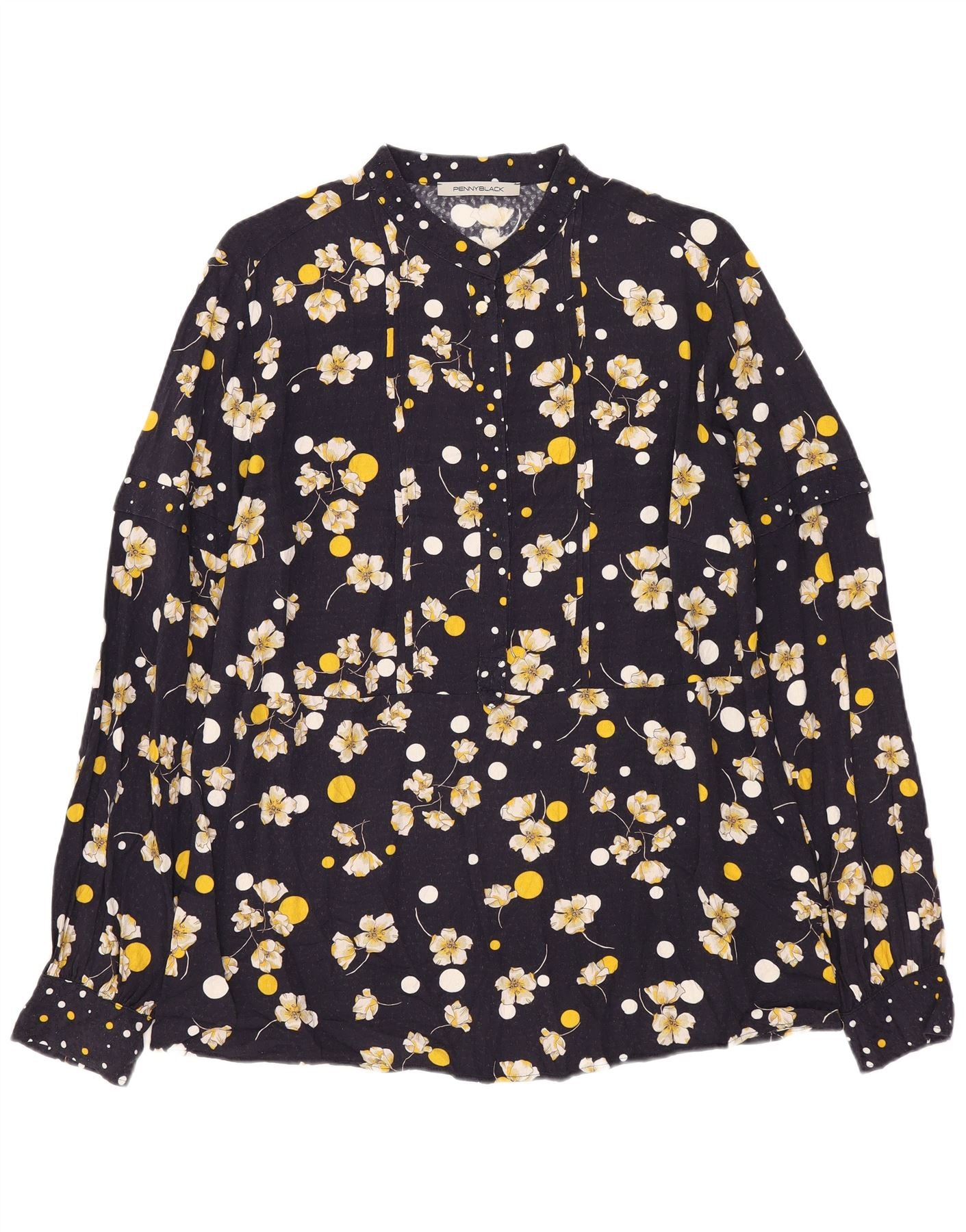 - Descrição da IA: Esta blusa feminina Penny Black é confeccionada em rayon de viscose macio. Apresenta um impressionante padrão floral em branco e amarelo sobre um fundo azul marinho. O decote com gola e fecho de botão oferecem um visual clássico. Mangas compridas com punhos abotoados completam o design. Tem um ajuste regular para um uso confortável.