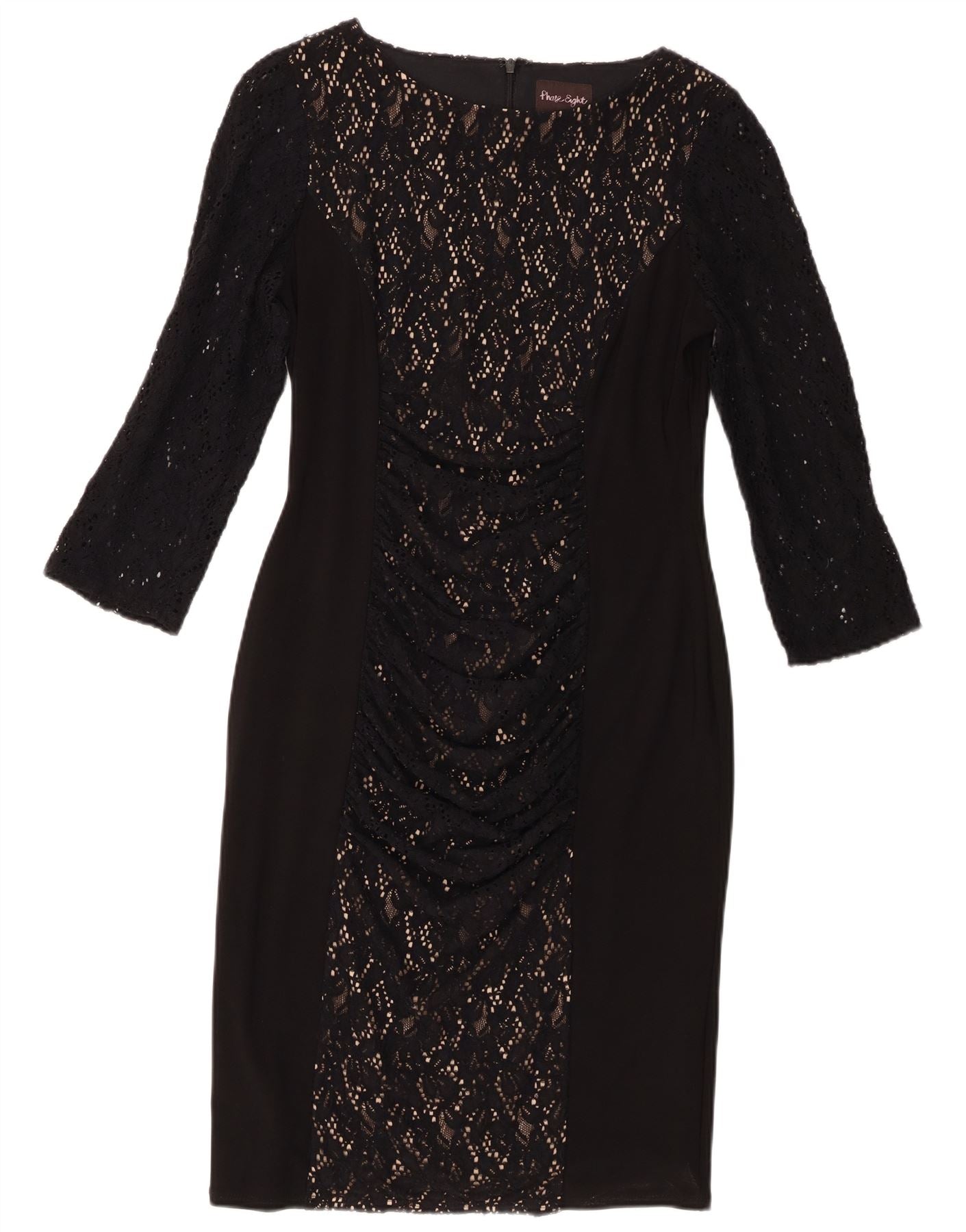 - Descrição da IA: Este vestido feminino Phase Eight é feito de poliamida preta com uma delicada sobreposição de renda floral. Possui gola redonda clássica e elegantes mangas 3/4. A silhueta slim fit é realçada por detalhes franzidos na frente. Um forro completo garante conforto e um caimento suave. Este vestido sofisticado oferece elasticidade para facilitar os movimentos, perfeito para ocasiões formais.