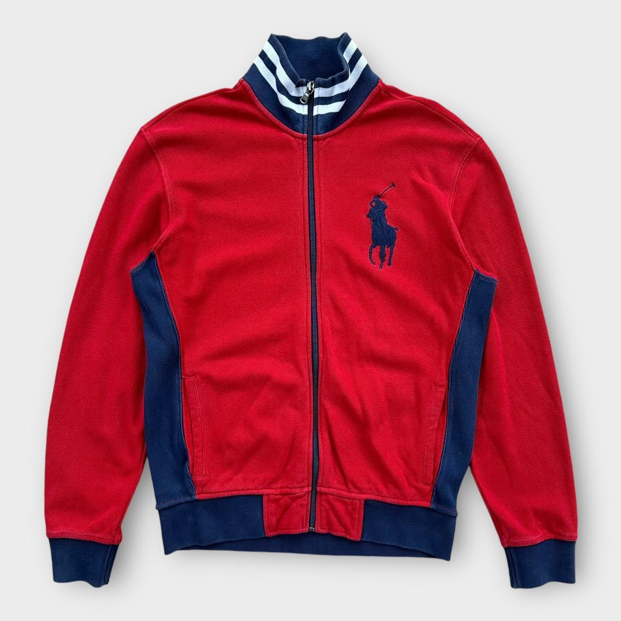 Jaqueta Polo Ralph Lauren vermelha e azul-marinho do início dos anos 2000 com zíper e grande logotipo de pônei bordado no peito