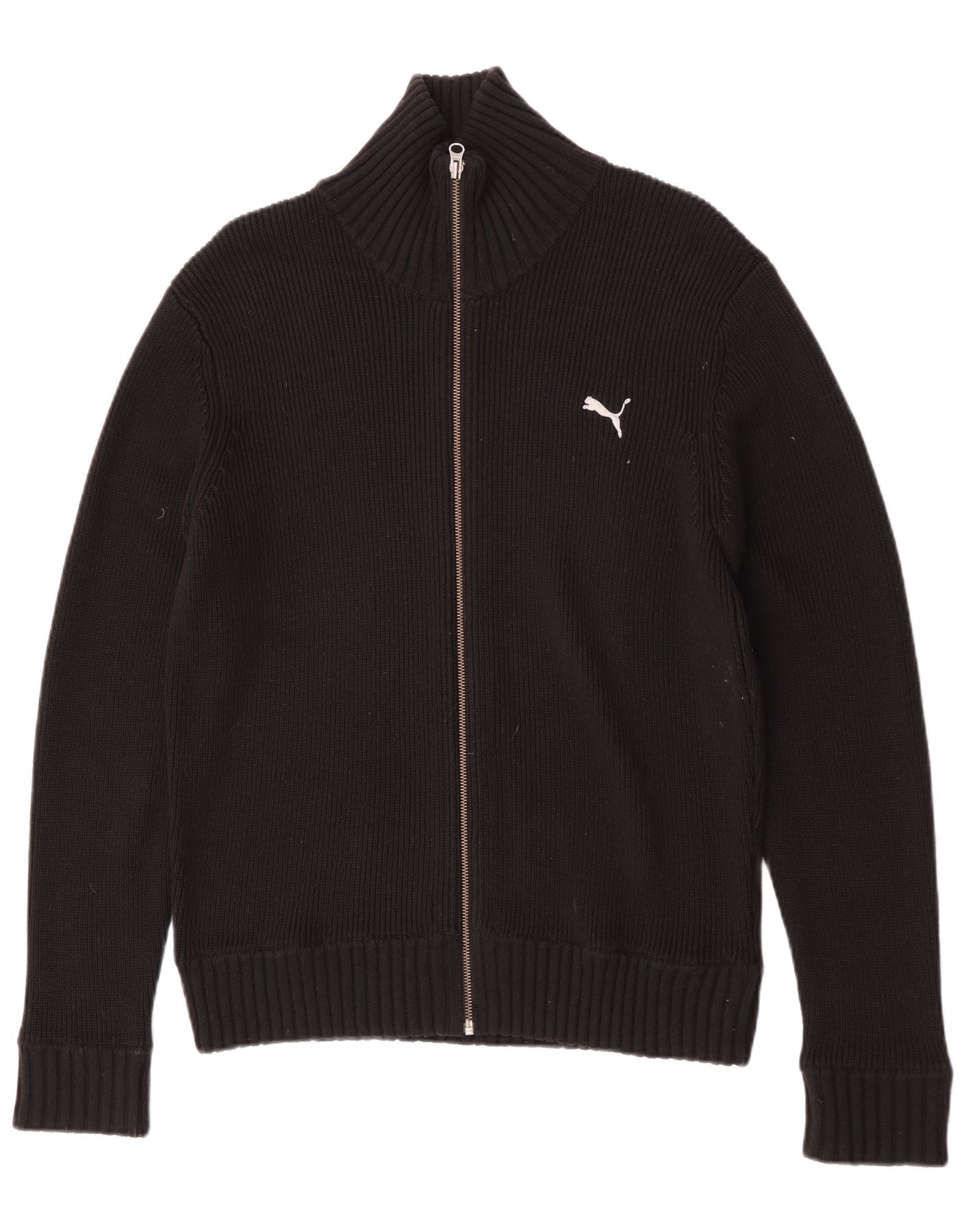 - Descrição da IA: Este suéter cardigã masculino da Puma é confeccionado em um confortável tecido de malha preta. Possui gola alta e fecho de correr completo para um estilo versátil. As mangas compridas terminam em punhos canelados, combinando com a bainha. O ajuste regular garante conforto e facilidade de movimento. Um sutil logotipo da Puma é bordado no peito. Este estilo esportivo oferece calor e uma estética limpa e atlética.