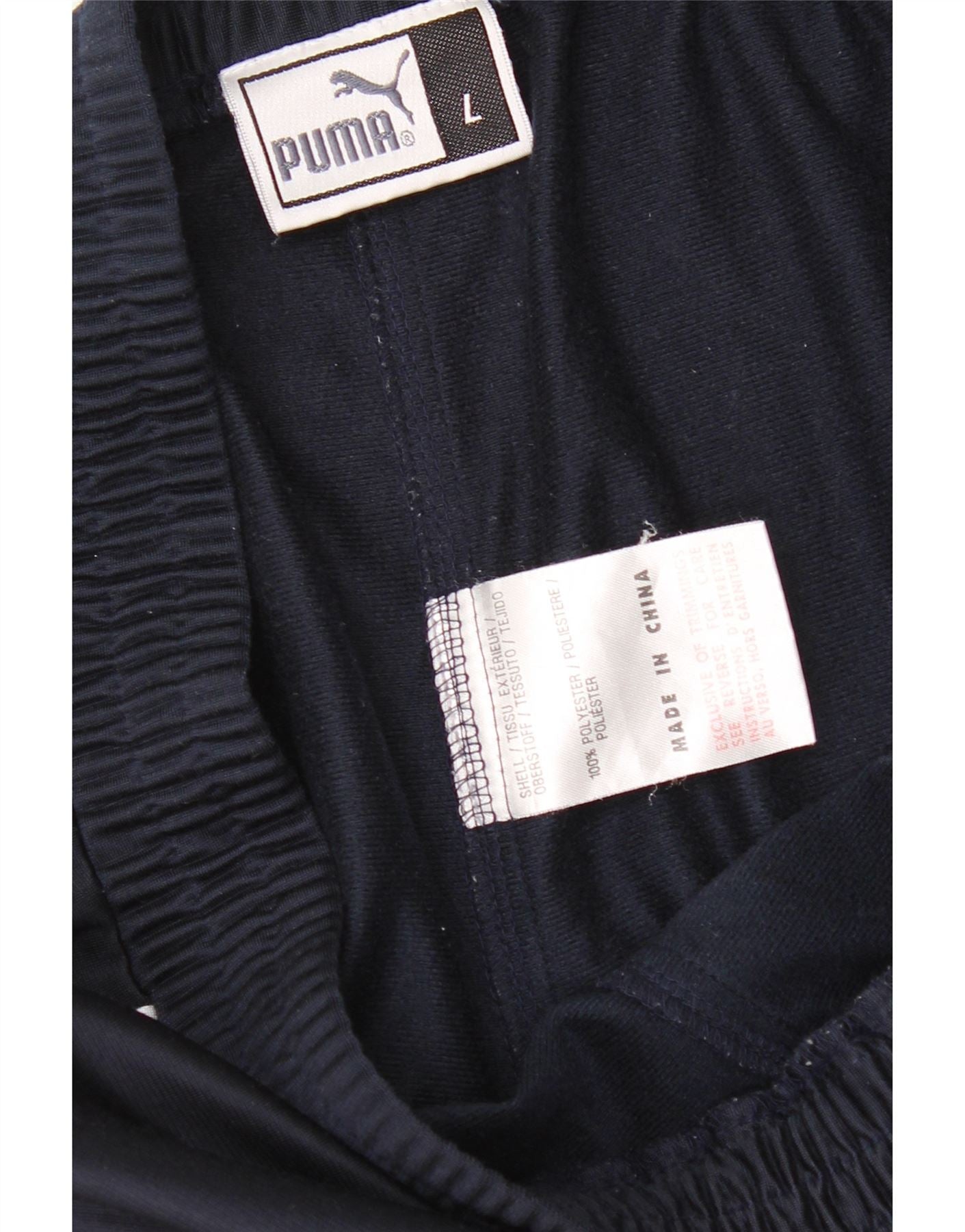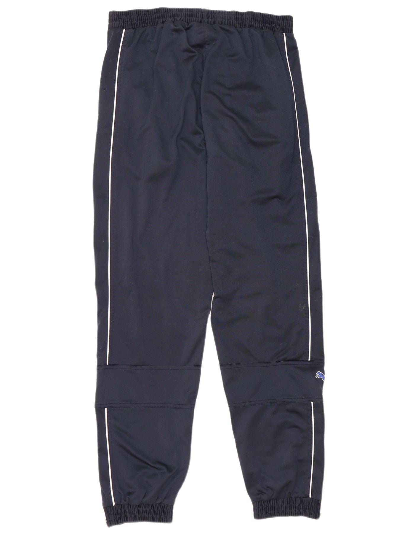 • Descrição da IA: Esta calça de treino masculina da Puma é confeccionada em poliéster liso azul marinho. Eles apresentam um elástico na cintura para maior conforto e um ajuste regular de jogging. Listras brancas percorrem as laterais, adicionando um detalhe atlético clássico. O logotipo da Puma é colocado sutilmente na coxa esquerda. Os tornozelos com punhos completam a silhueta desportiva, proporcionando uma sensação de segurança.