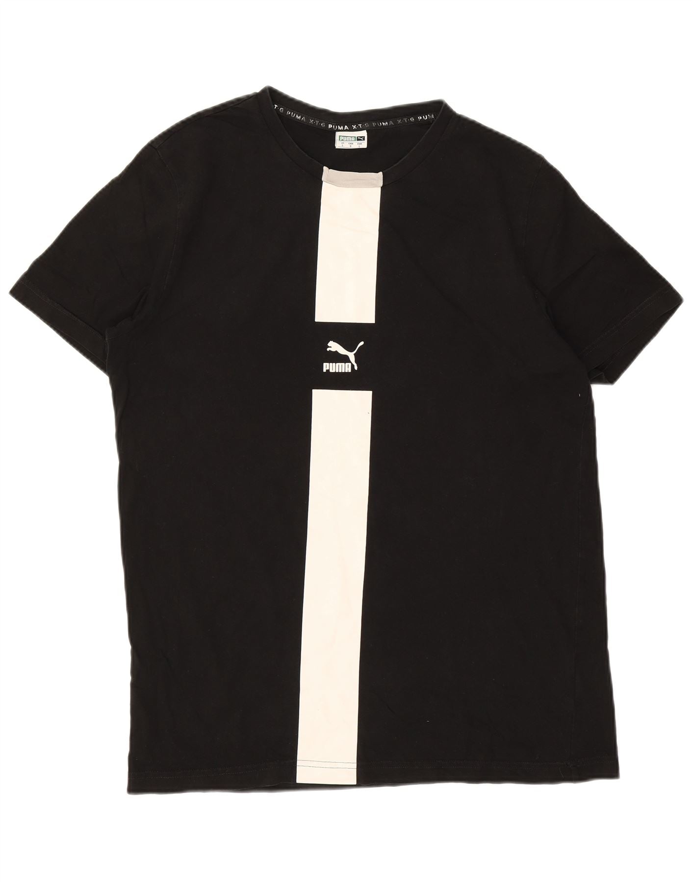 - Descrição da IA: Esta camiseta masculina da Puma é confeccionada em tecido jersey preto macio. Possui gola redonda clássica e mangas curtas confortáveis. Uma ousada faixa colorida branca corre verticalmente pela frente, posicionada centralmente. O icônico logotipo da Puma está sutilmente integrado nesta faixa. Seu ajuste regular garante uma silhueta confortável e versátil. Este top oferece uma estética moderna e desportiva para uso diário.