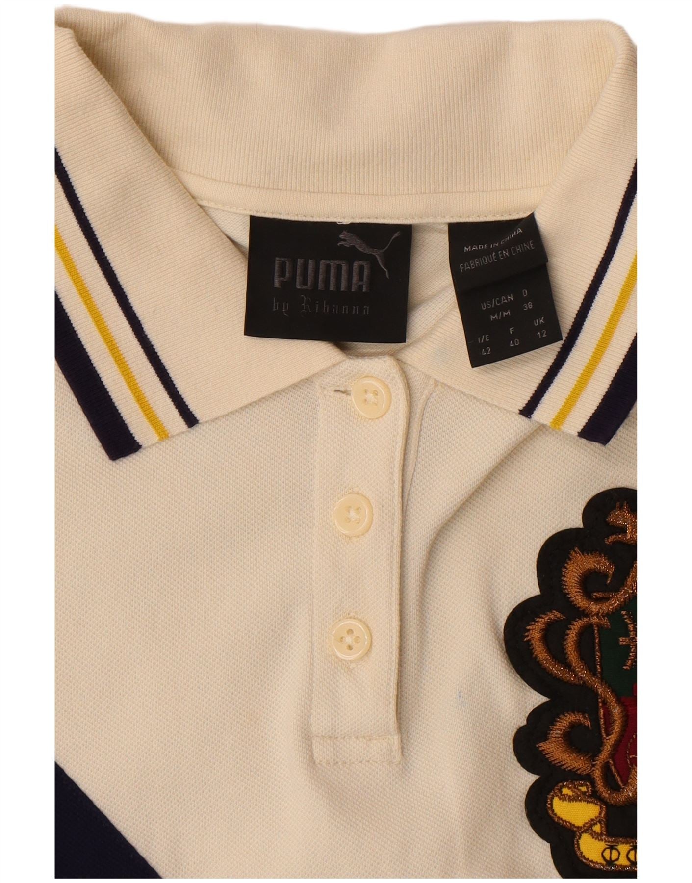 - Descrição da IA: Este vestido polo feminino da Puma é confeccionado em tecido de malha branco confortável com elasticidade. Possui decote clássico com gola e fechamento por botão. Mangas curtas e corte justo criam uma silhueta elegante. O design apresenta um padrão de bloco de cores ousado com detalhes em azul marinho e amarelo. Um detalhe gráfico bordado adorna o peito, acrescentando um toque distinto. Este vestido esportivo oferece estilo e conforto.
