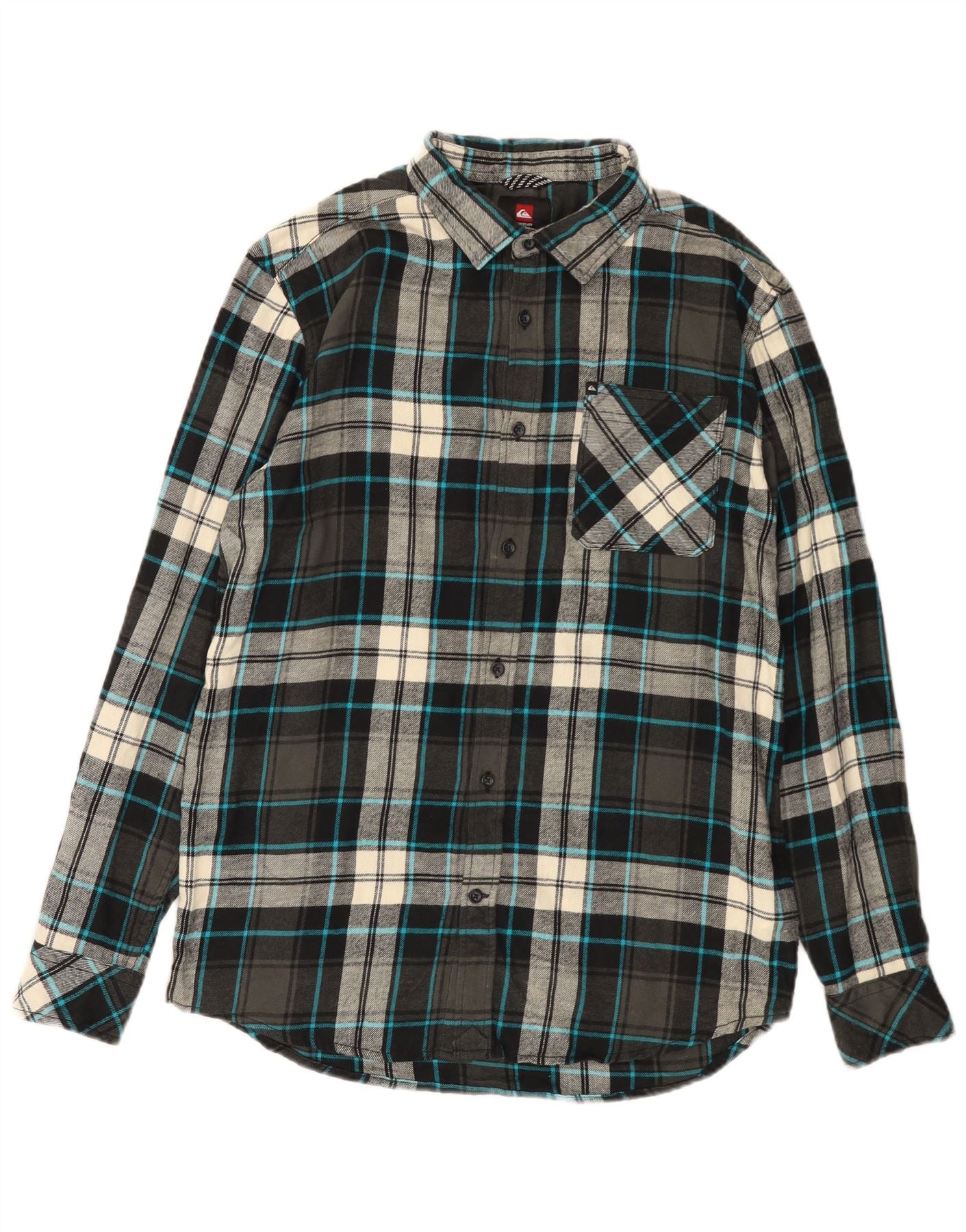 - Descrição da IA: Esta camisa de flanela masculina Quiksilver é confeccionada em flanela macia 100% algodão. Apresenta um clássico padrão xadrez multicolorido em tons de preto, cinza e azul. O decote com gola e botões frontais completos oferecem um visual atemporal. Mangas compridas com punhos abotoados e bolso no peito acrescentam detalhes práticos. Um ajuste regular garante um uso confortável e fácil colocação em camadas. Um sutil destaque do logotipo completa o design.