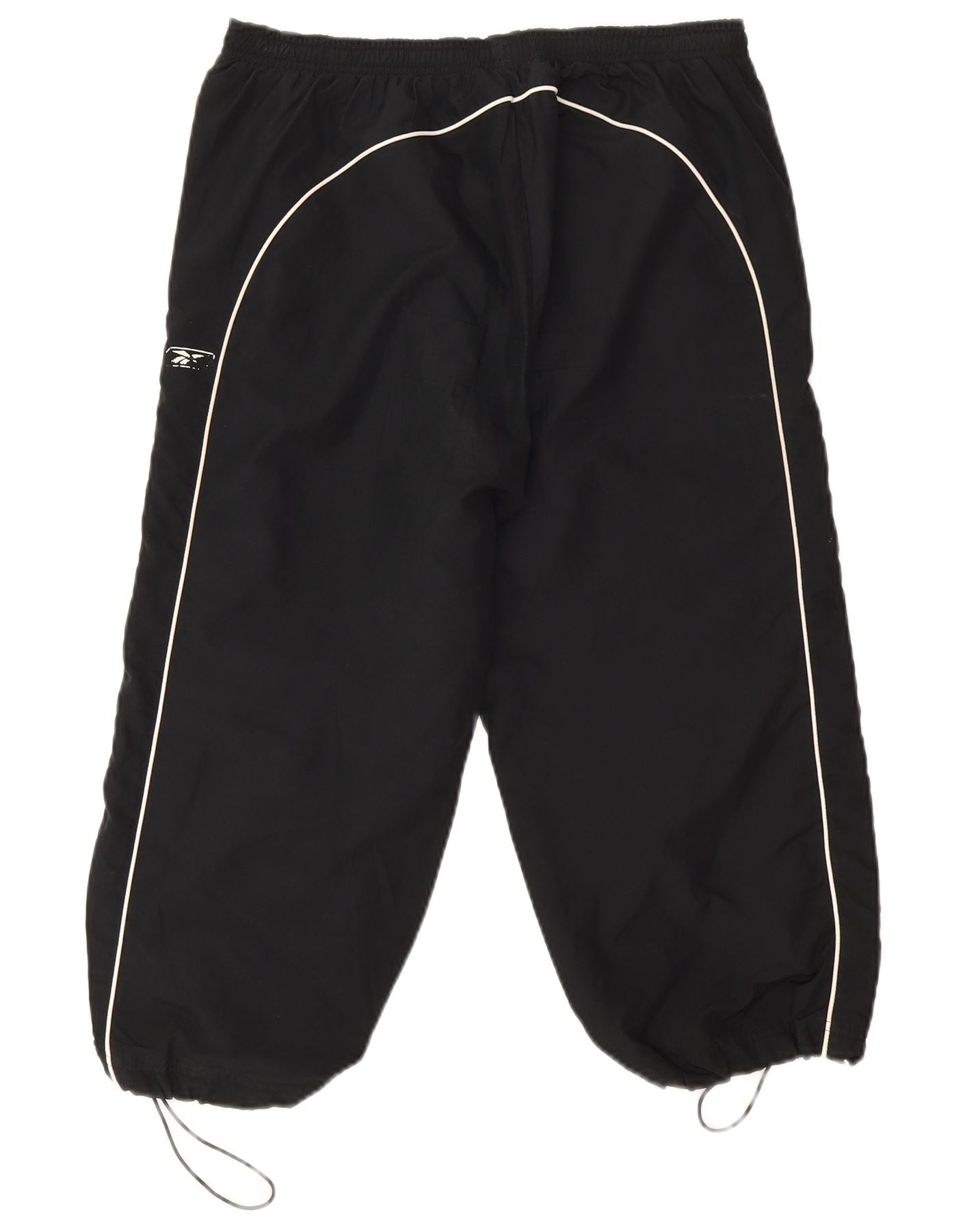 - Descrição da IA: Estas calças de treino femininas Reebok são confeccionadas em tecido preto, oferecendo um acabamento à prova de vento. Eles apresentam um ajuste capri descontraído com cintura elástica para maior conforto. Cordões ajustáveis na bainha permitem um formato personalizável. O debrum branco percorre as laterais, adicionando um contraste esportivo. Bolsos práticos e um logotipo sutil completam o design.