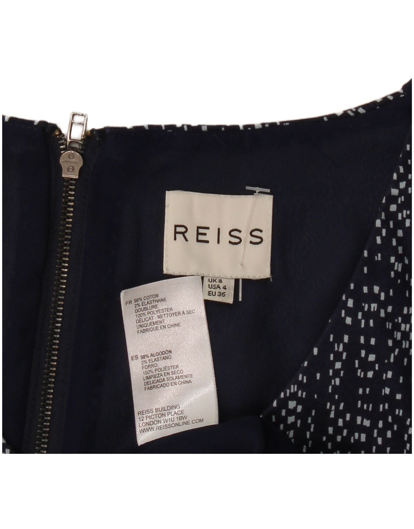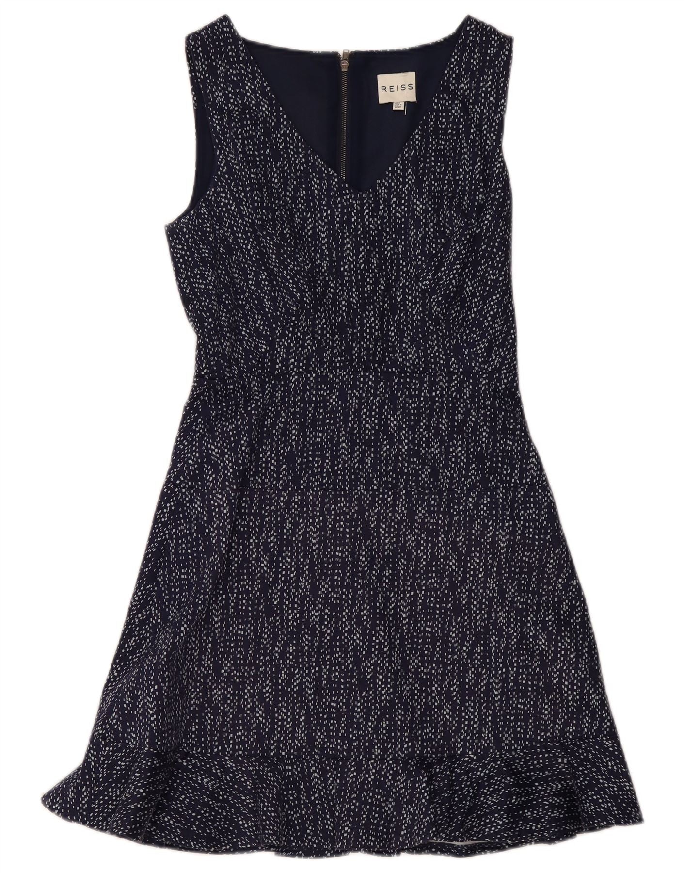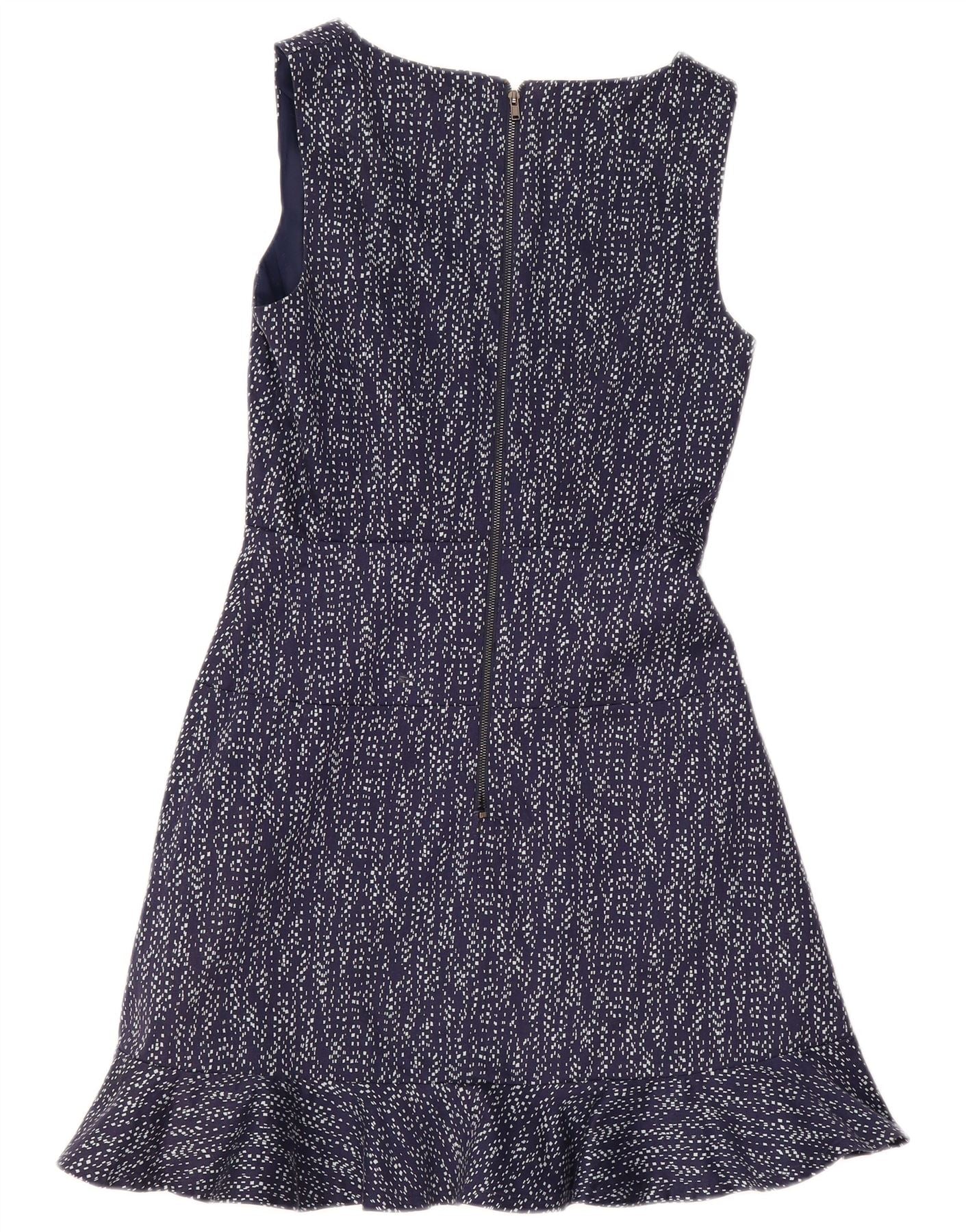 REISS Womens Sleeveless A-Line Dress UK 8 Small Navy Blue Geometric Cotton