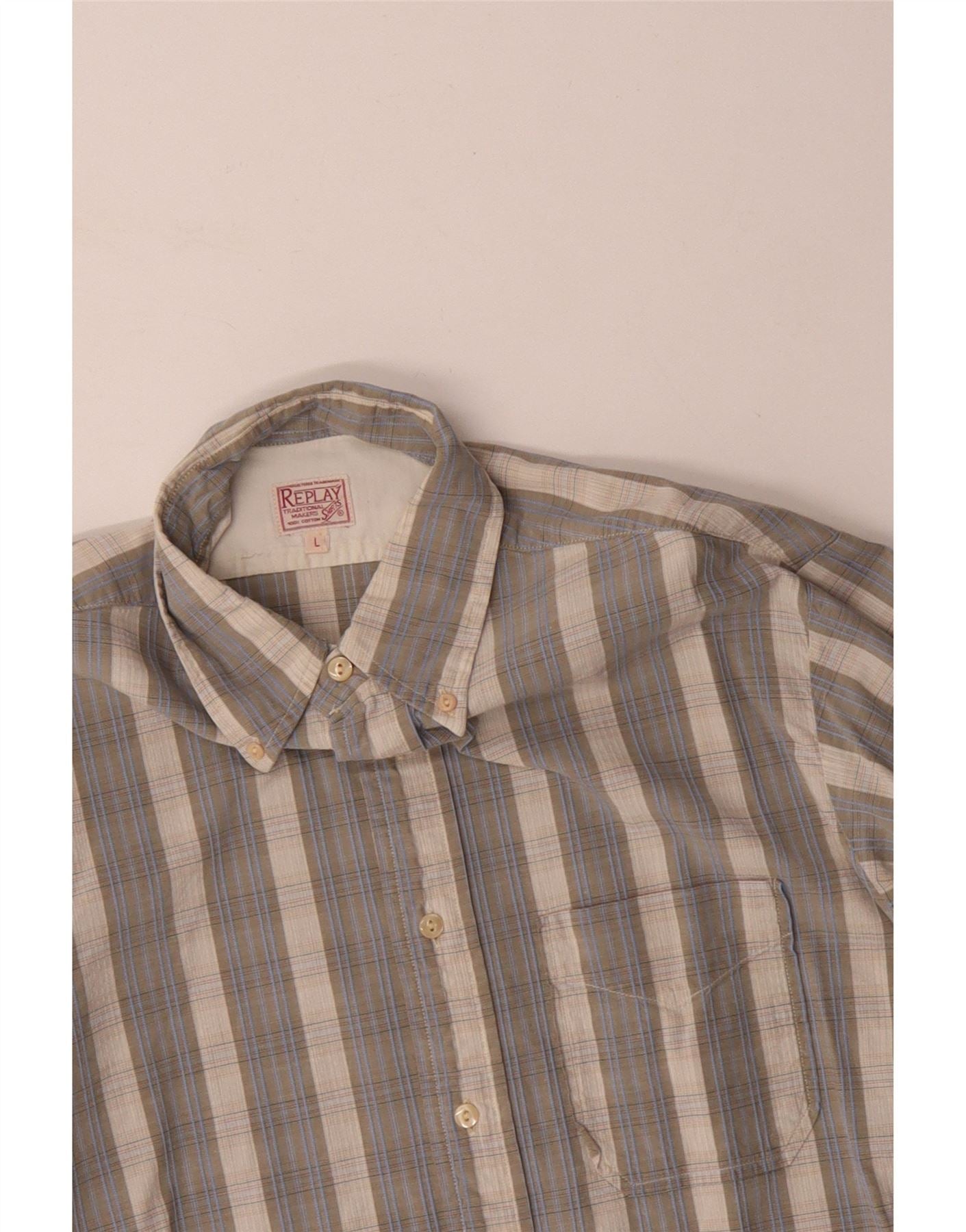 - Descrição da IA: Esta camisa masculina Replay é confeccionada em tecido leve. Apresenta um padrão xadrez clássico em tons multicoloridos de bege, azul e cinza. A camisa tem decote com gola e fecho frontal completo com botões. As mangas compridas terminam com punhos abotoados. Um único bolso no peito acrescenta detalhes práticos. O ajuste regular garante um uso confortável. Um sutil destaque do logotipo completa o design.