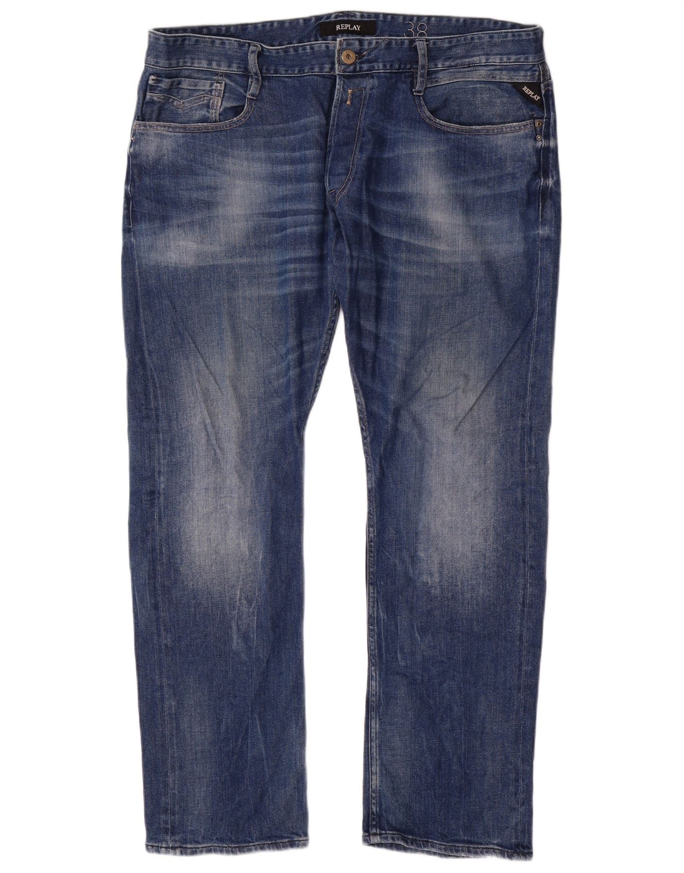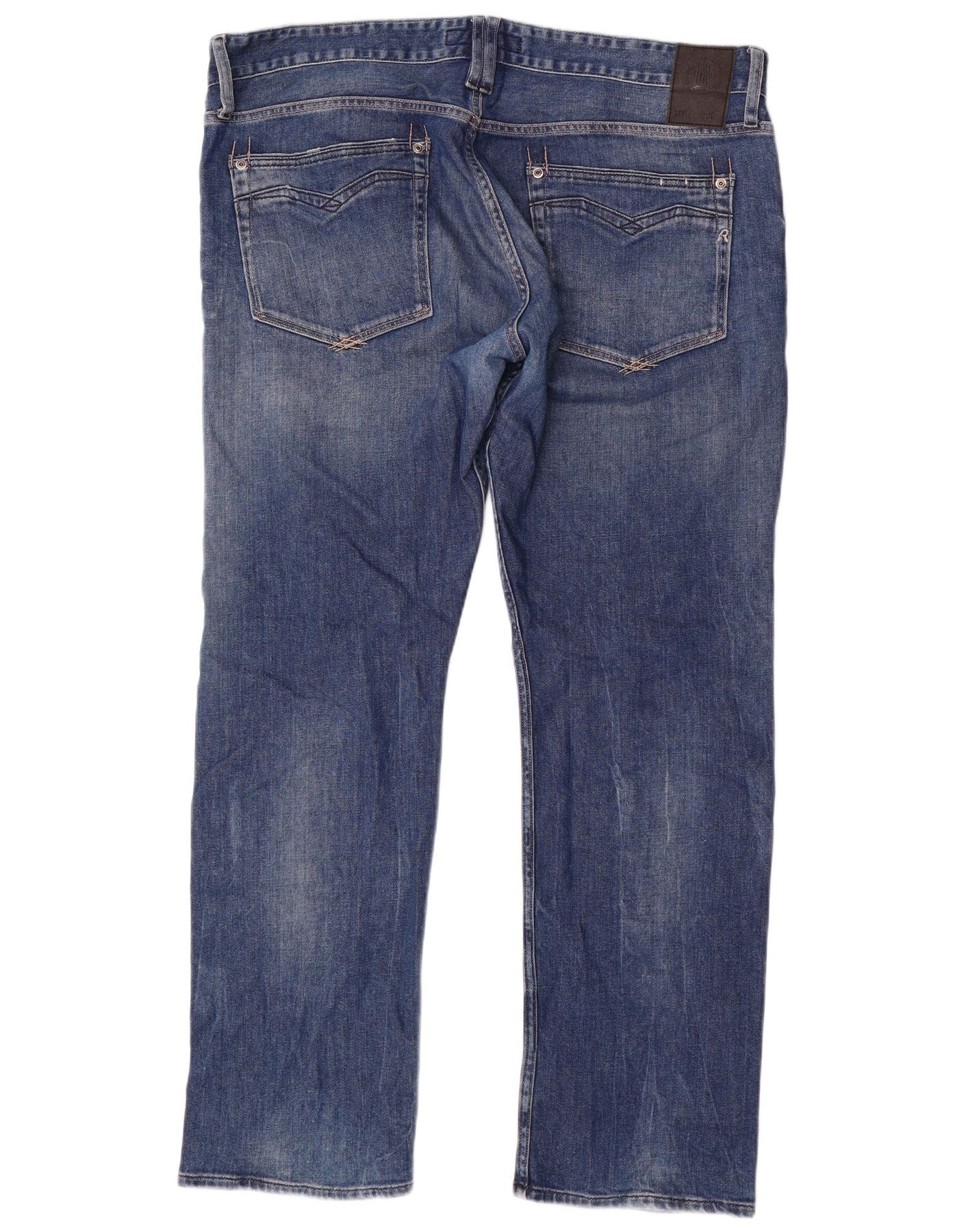 - AI Description: These Replay mens straight jeans are crafted from blue denim with a comfortable stretch. They feature a classic straight leg and a regular fit. The button closure provides a secure fastening. Distressed detailing adds a rugged, worn-in look. Practical pockets offer functionality. A subtle logo accent completes the classic style.