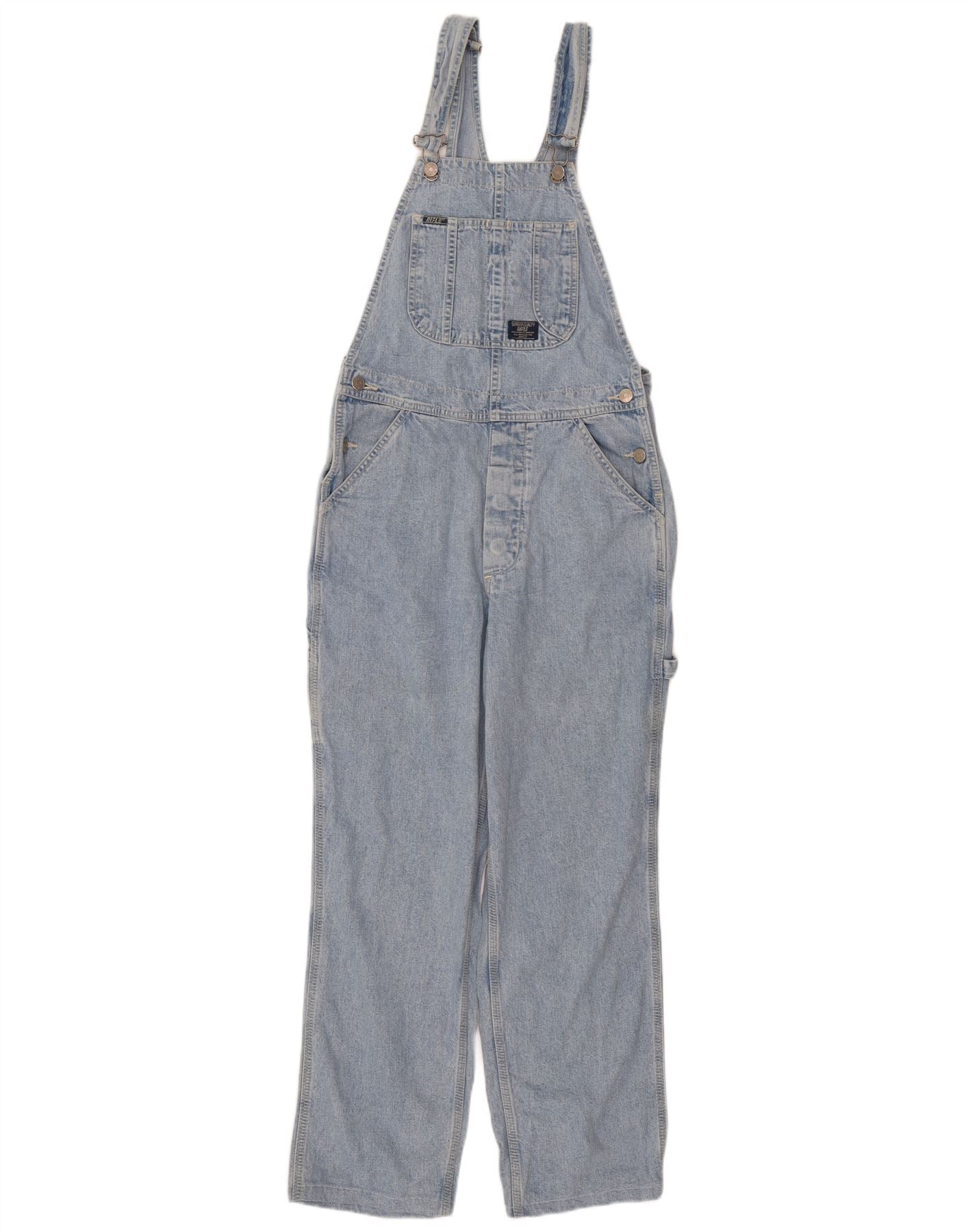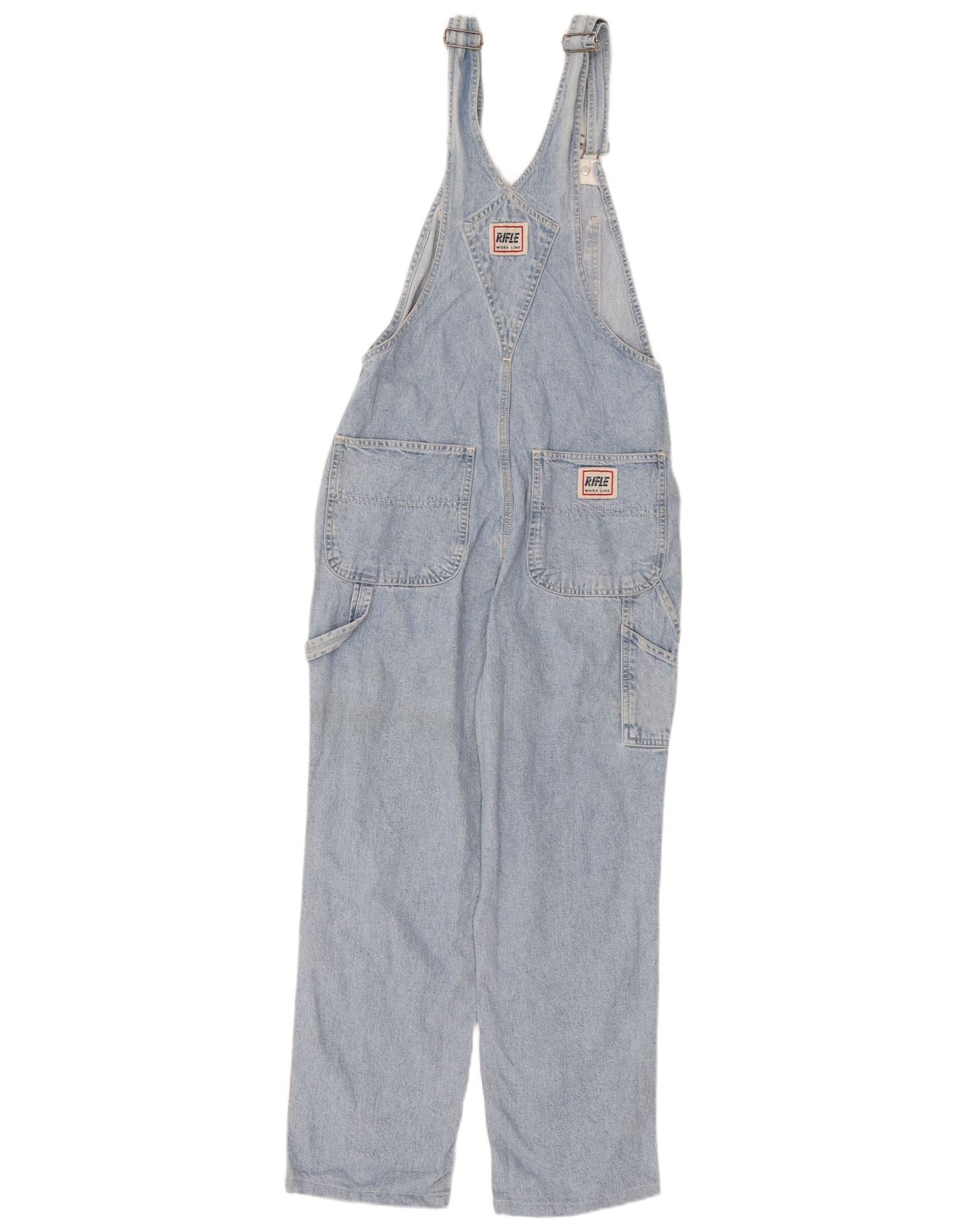 - Descrição da IA: Este macacão feminino Rifle é confeccionado em jeans 100% algodão azul claro. Possui um ajuste clássico regular com alças ajustáveis. A frente do babador inclui um bolso no peito. Pernas retas oferecem uma silhueta confortável. Botões de metal prendem os fechos laterais e as alças. Vários bolsos funcionais acrescentam praticidade. Um patch de marca adiciona um detalhe de assinatura. Este estilo clássico oferece um apelo atemporal.