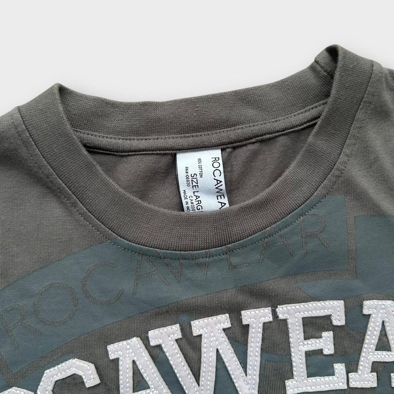 Camiseta de hip hop Y2K Rocawear do início de 2000 em cinza com estampa e bordado no peito
