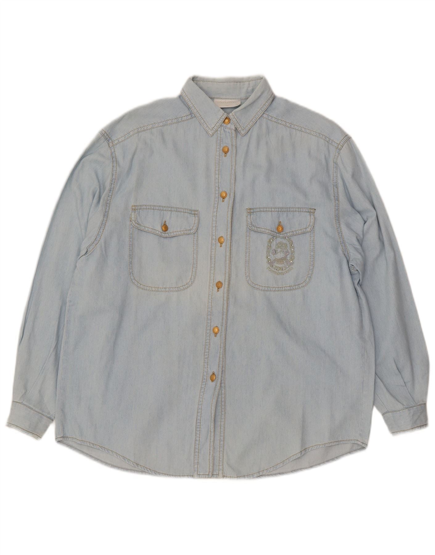 - Descrição da IA: Esta camisa jeans feminina Roccobarocco é confeccionada em jeans 100% algodão azul claro. Possui decote clássico com gola e mangas compridas com punhos abotoados. O ajuste regular garante um uso confortável. Um botão completo na frente e dois bolsos no peito acrescentam detalhes funcionais. Um bolso é sutilmente bordado, realçando seu estilo clássico. Esta peça versátil oferece apelo atemporal para roupas do dia a dia.
