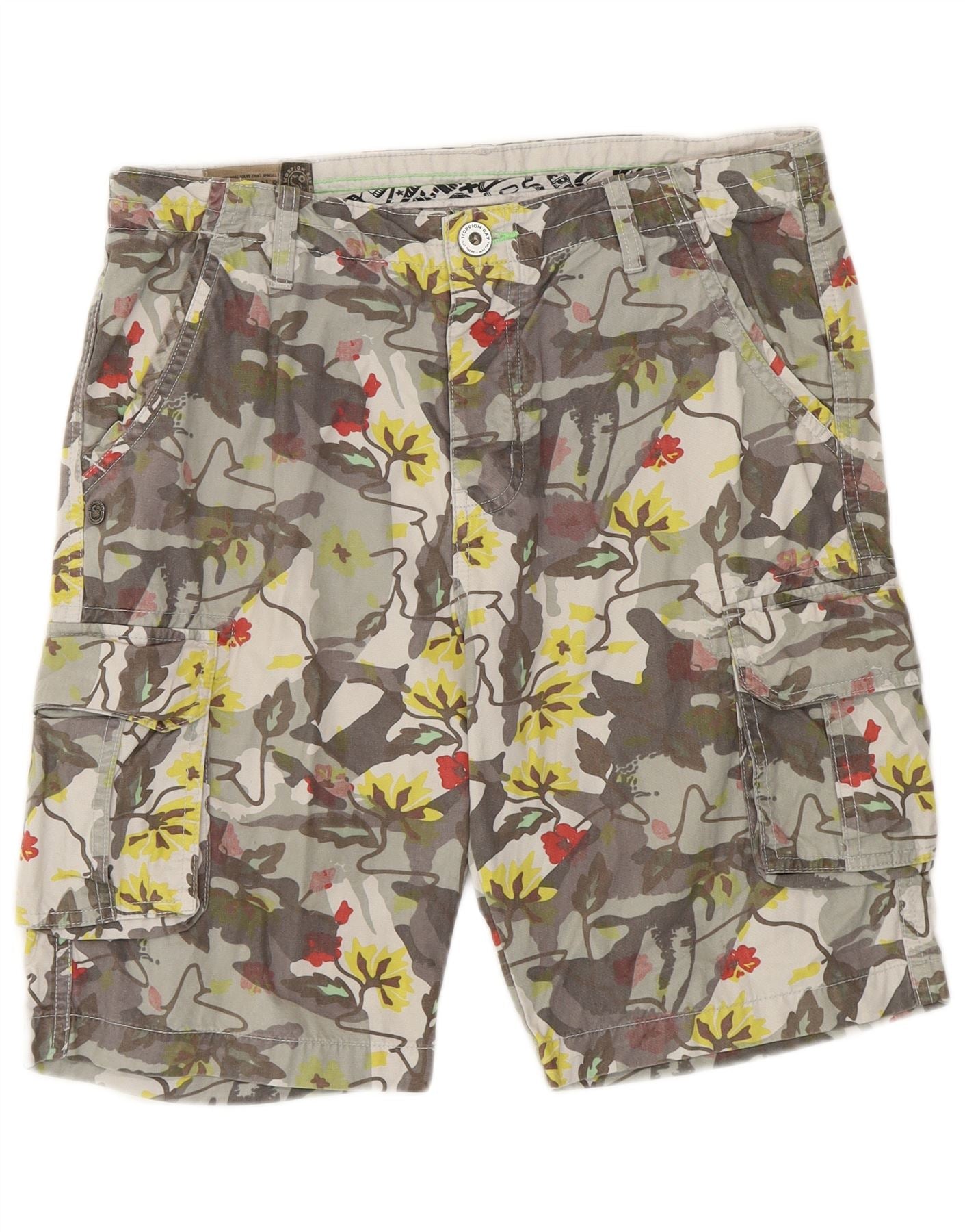 - Descrição da IA: Estes shorts cargo masculinos Scorpion Bay são feitos de um tecido durável, oferecendo uma sensação robusta. Eles apresentam um impressionante padrão floral multicolorido, misturando tons de cinza, cáqui e amarelo. O ajuste regular garante conforto e facilidade de movimento. Um fecho de correr e um botão fixam a cintura. Vários bolsos proporcionam utilidade prática. Este estilo praiano oferece um look descontraído e estruturado, perfeito para uso casual.