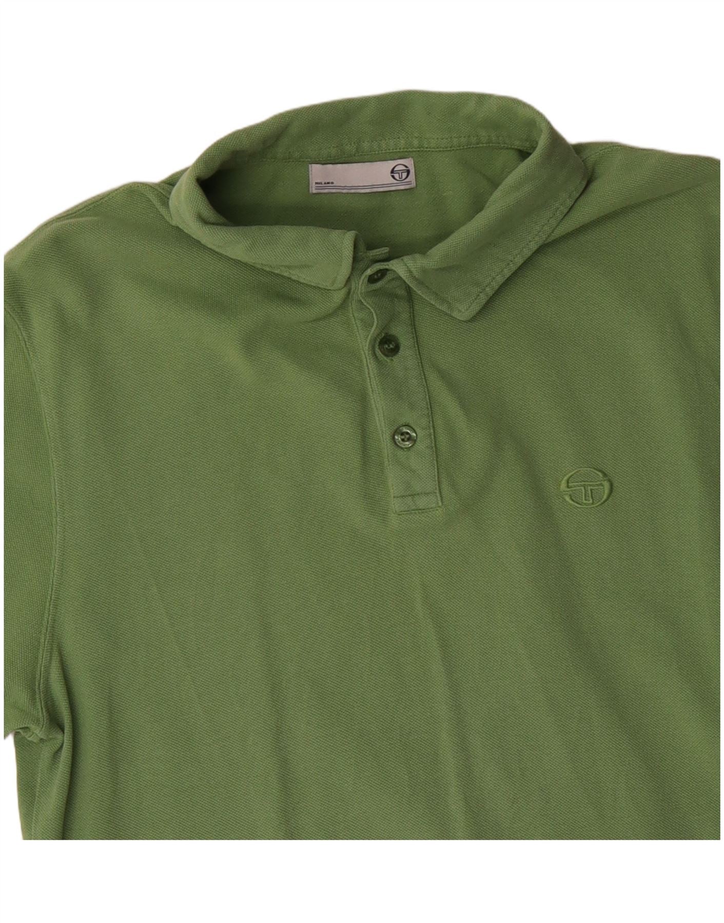 - Descrição da IA: Esta camisa pólo masculina Sergio Tacchini é confeccionada em um confortável tecido de malha verde. Possui decote clássico com gola e mangas curtas. A carcela com botões adiciona detalhes tradicionais. Um ajuste regular garante facilidade de movimento e uma silhueta atemporal. O sutil logotipo bordado no peito confere um toque exclusivo.