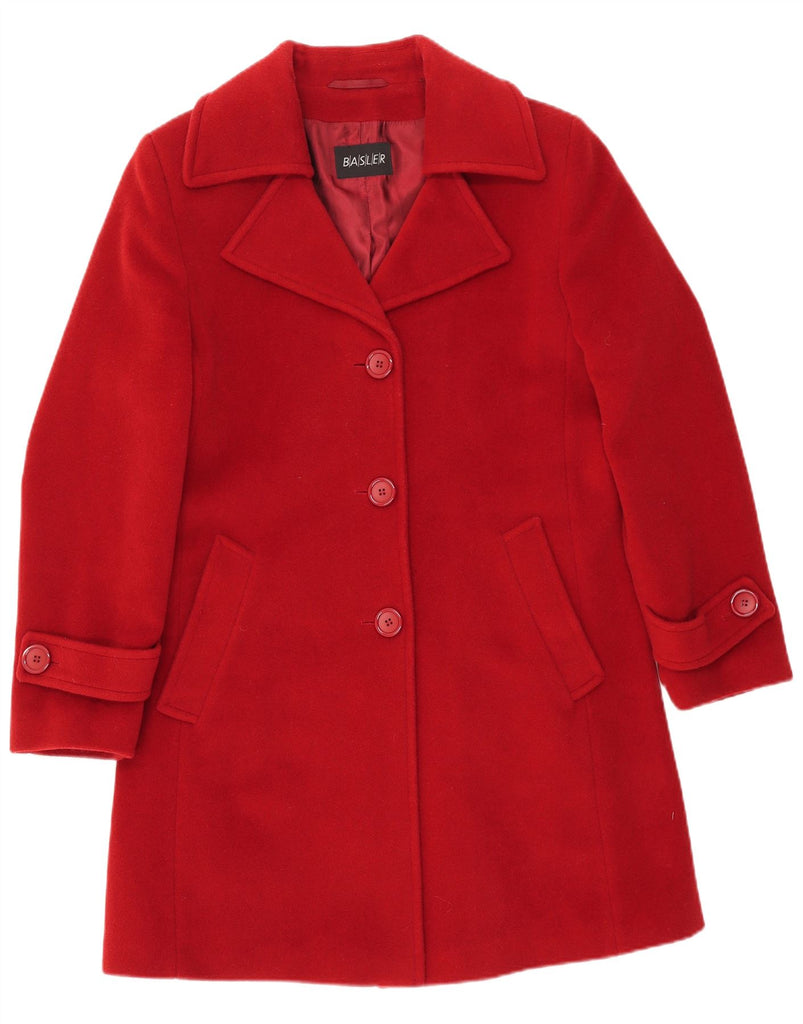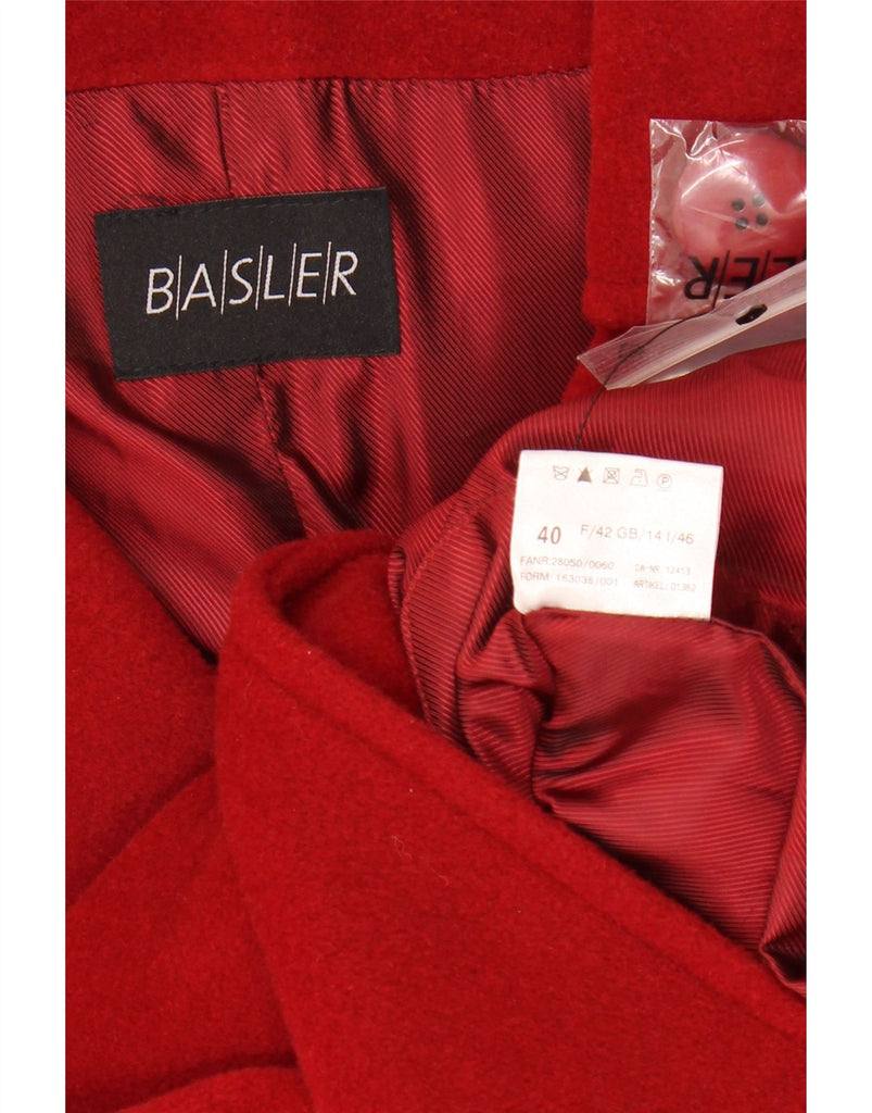 - Descrição da IA: Este casaco feminino Basler é feito de lã vermelha rica, oferecendo uma textura luxuosa. Possui decote clássico com gola e mangas compridas. A frente é fechada com fecho de três botões, complementada por bolsos funcionais. Seu corte regular oferece uma silhueta atemporal, incorporando elegância clássica, perfeita para camadas sofisticadas.