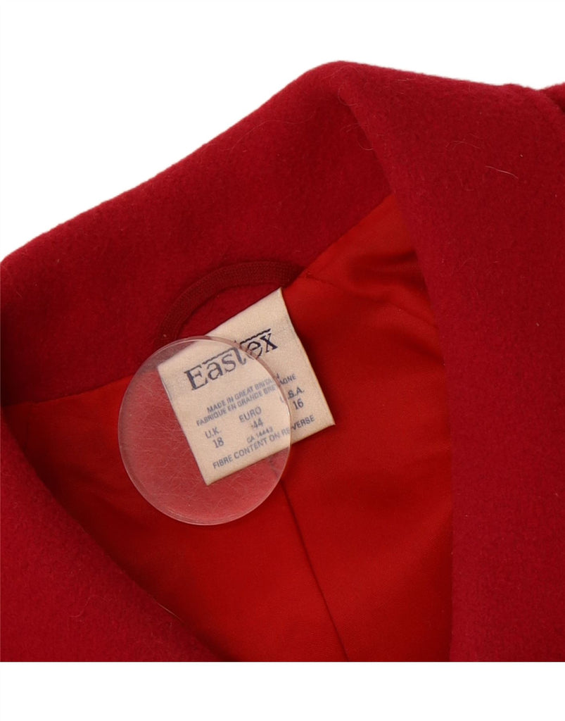 - Descrição da IA: Este casaco feminino Eastex em vermelho apresenta um estilo clássico com decote com gola. O tecido de lã oferece caimento regular e mangas compridas. Possui fechamento por botão, é totalmente forrado e inclui bolsos e ombreiras. Fabricado na Grã-Bretanha, este casaco oferece calor e elegância atemporal.