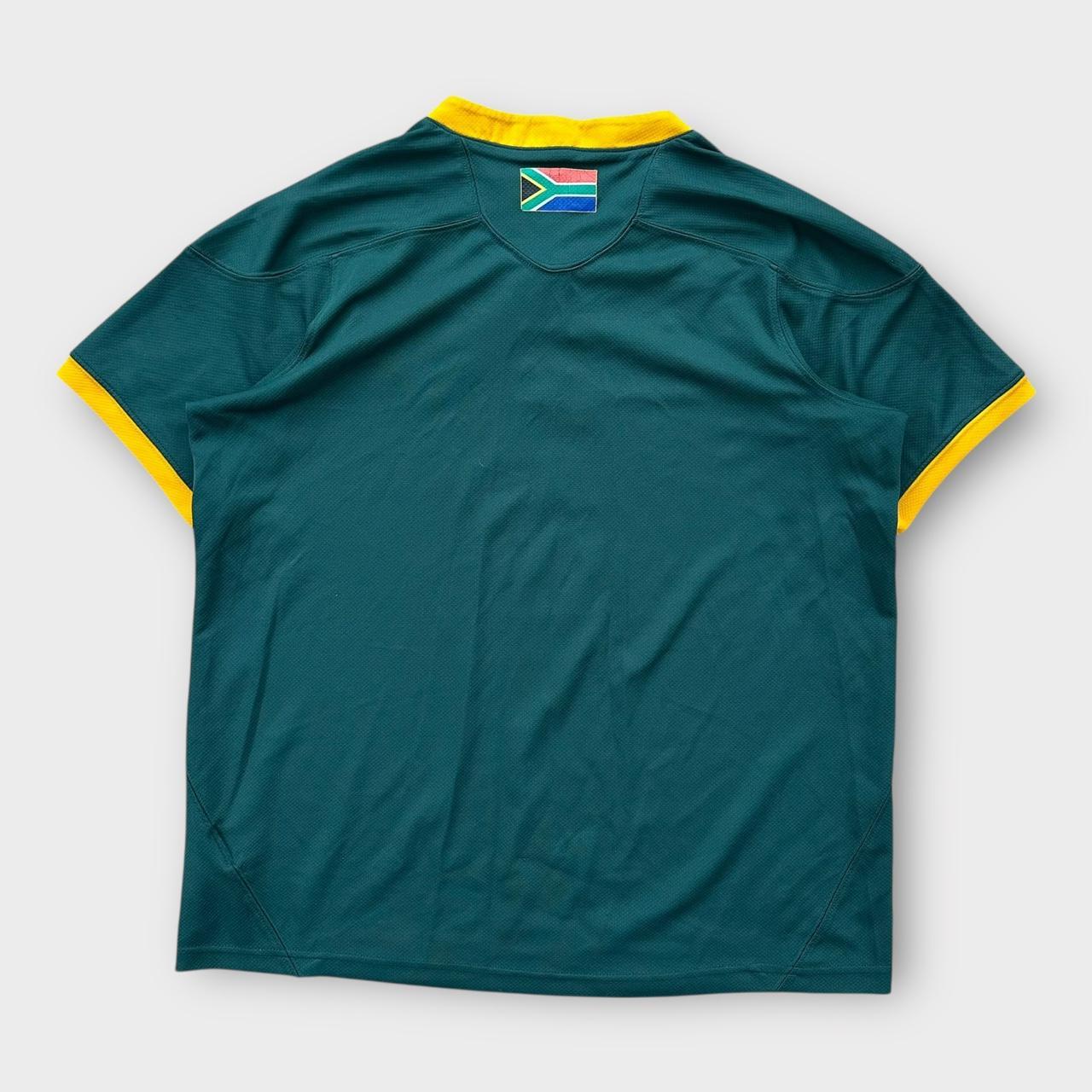 Top de rugby da África do Sul da ASICS em verde e amarelo com logotipos bordados e patrocinador no peito
