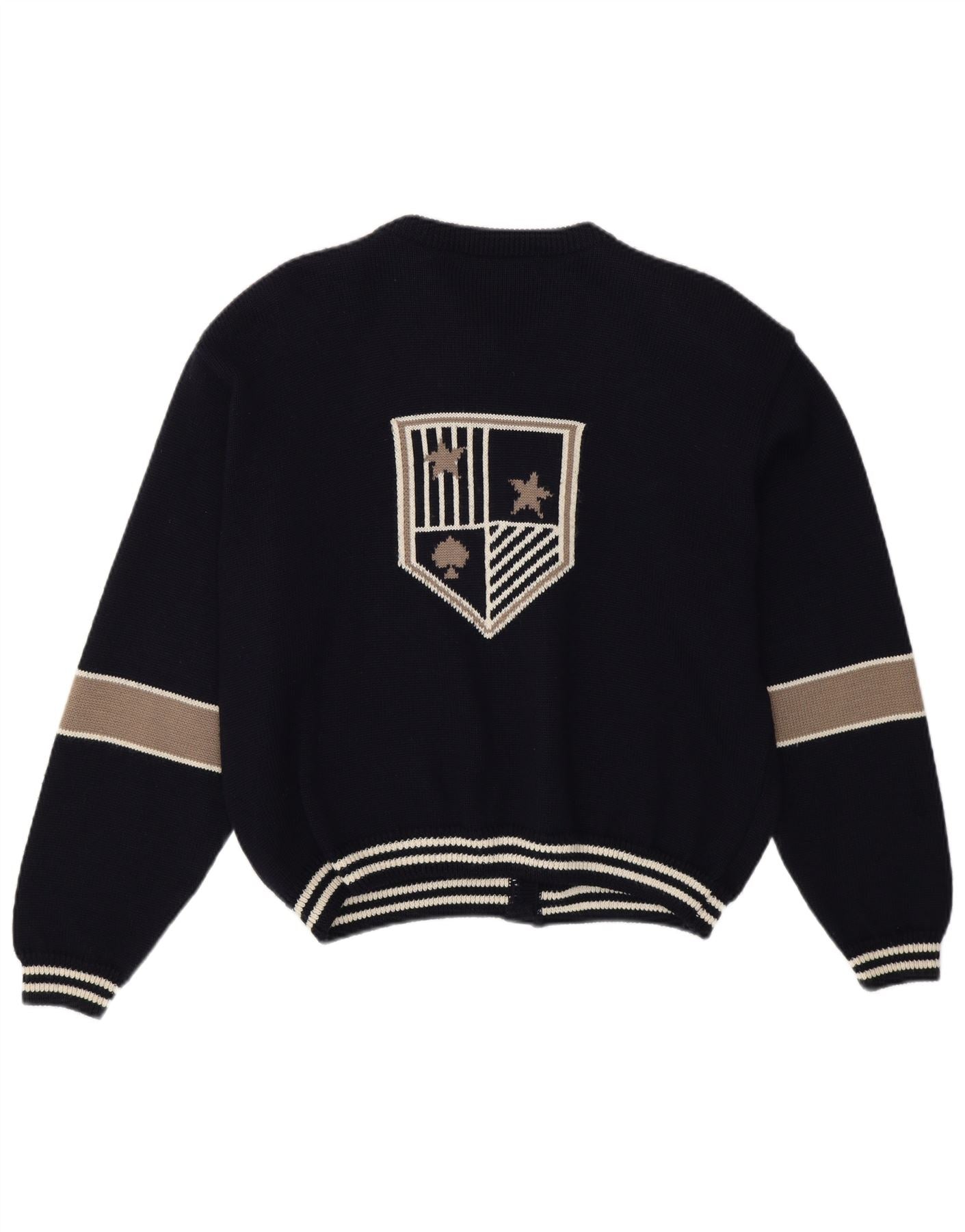 - Descrição da IA: Este suéter cardigã feminino St Michael é confeccionado em malha de lã azul marinho, oferecendo um toque macio, mas estruturado. Possui gola redonda clássica e botões frontais completos. As mangas compridas têm punhos, combinando com a bainha canelada. Um distintivo brasão gráfico adorna o peito e as costas, adicionando um toque elegante. Listras contrastantes nas mangas, punhos e bainha completam o design. O ajuste regular garante um uso confortável.
