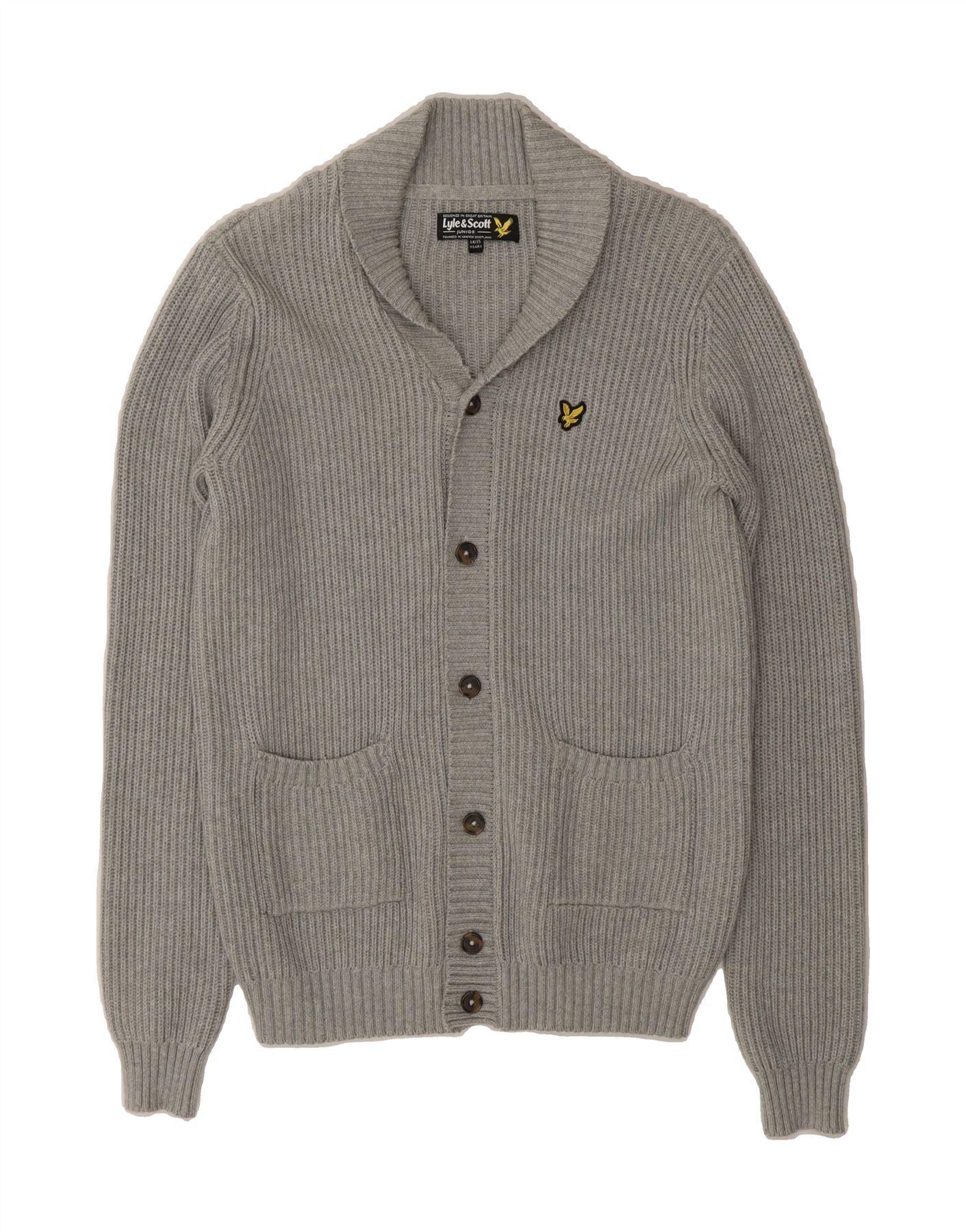 - Descrição da IA: Este suéter cardigã masculino usado da Lyle & Scott é confeccionado em malha 100% algodão. Em excelente estado, o cardigã cinza de manga comprida apresenta decote com gola e fecho de botão. Acentuado com botões e logotipo da marca, oferece caimento regular com bolsos práticos. A peça, rotulada como tamanho 14/15 anos, incorpora um estilo formal. Fabricado na Grã-Bretanha.