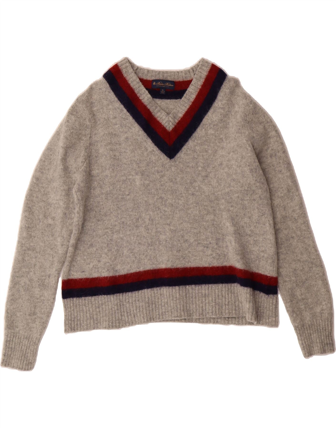 - Descrição da IA: Eleve seu guarda-roupa com este suéter usado da Brooks Brothers com decote em V. Confeccionado em malha 100% lã, este suéter cinza de manga comprida apresenta um padrão listrado formal e um ajuste confortável e regular. Ideal para camadas, este pulôver XL está em excelentes condições. Instruções de cuidados: Lavar à mão com água fria, remodelar e secar na horizontal. Feito na china.