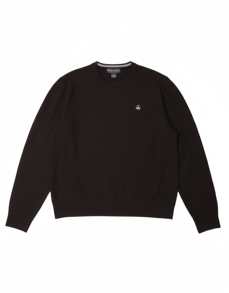 - Descrição da IA: Este suéter masculino com gola redonda da Brooks Brothers é feito de 100% lã Merino fina. Sua malha preta oferece um toque macio, leve e confortável. O clássico decote redondo e as mangas compridas definem a sua estrutura tradicional de pulôver. Um ajuste regular garante facilidade de uso e movimento. Este estilo é realçado por um detalhe sutil do logotipo da marca.