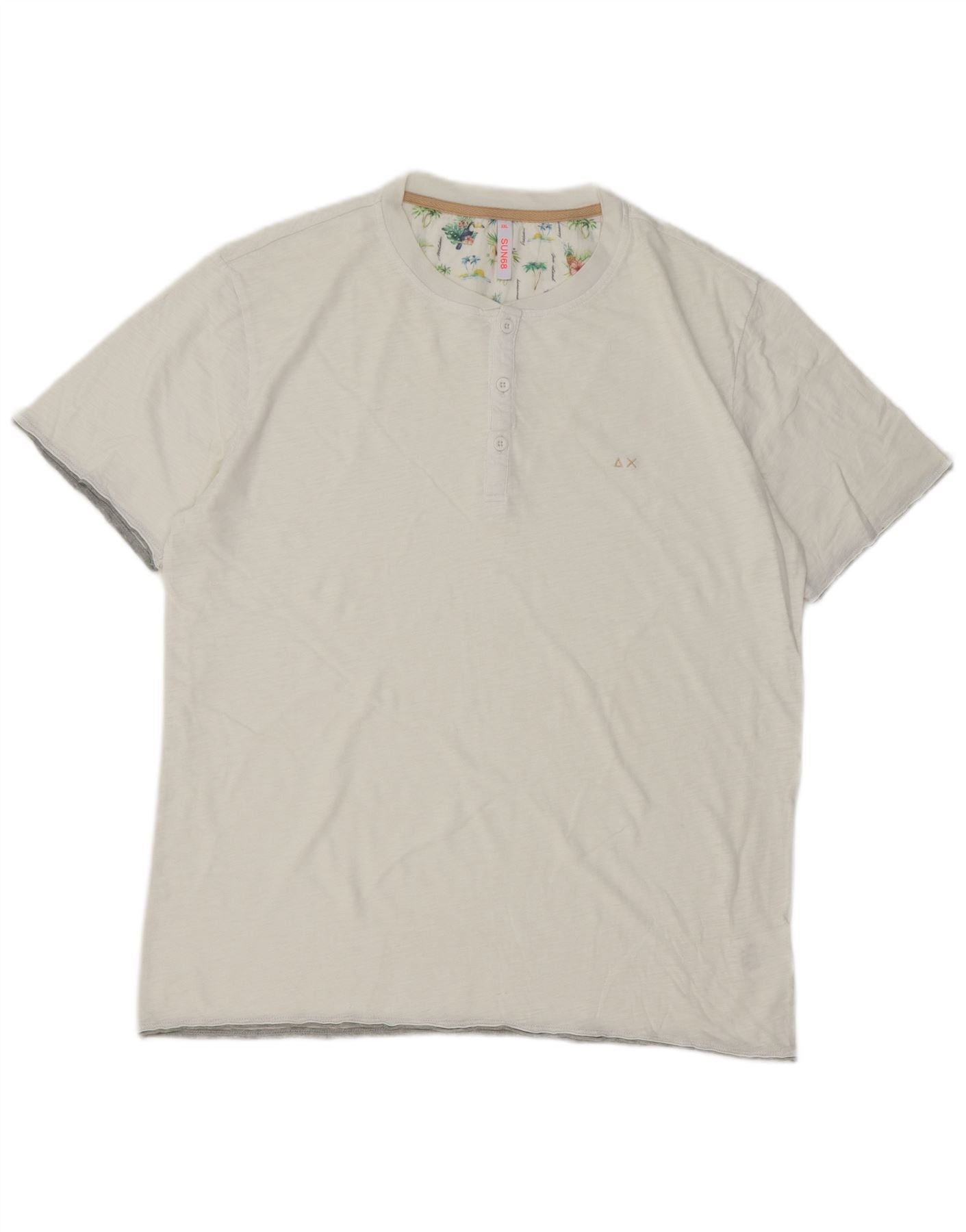 - Descrição da IA: Esta camiseta masculina Sun68 é confeccionada em jersey macio off white 100% algodão. Possui decote Henley clássico com carcela parcial de botões. Mangas curtas e ajuste regular garantem um uso confortável. Um detalhe sutil da marca adorna o peito. A gola interna revela um padrão havaiano vibrante, adicionando um toque único. Este top versátil oferece uma estética descontraída e refinada para o estilo do dia a dia.