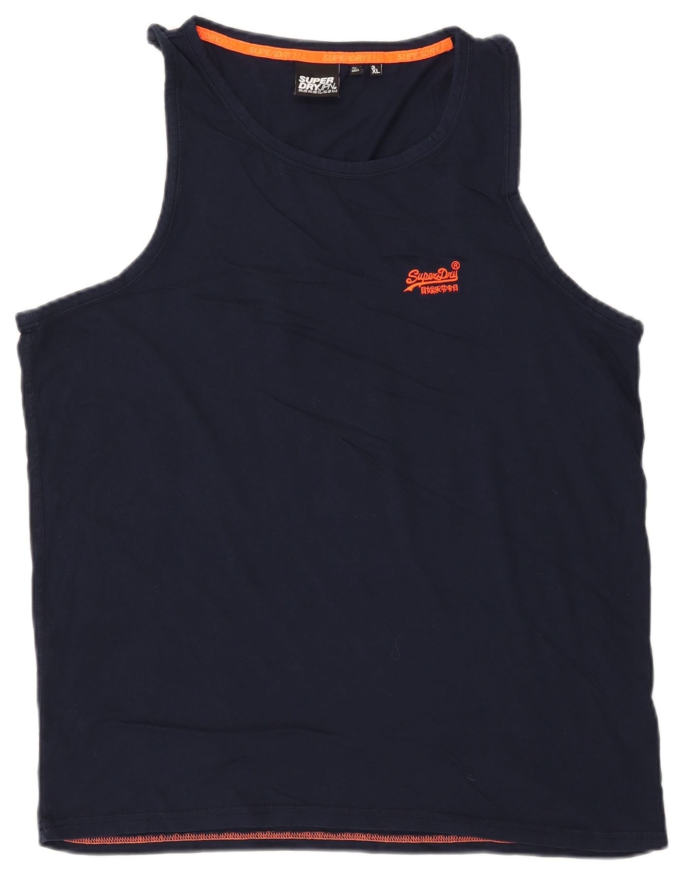 - Descrição da IA: Este colete masculino Superdry é confeccionado em jersey de algodão azul marinho macio. Possui gola redonda clássica e design sem mangas. O ajuste regular garante conforto e facilidade de movimento. Um logotipo laranja da Superdry é exibido com destaque no peito. A bainha e o decote apresentam costuras sutis em laranja para um detalhe contrastante. Este top leve e respirável é perfeito para uso casual.