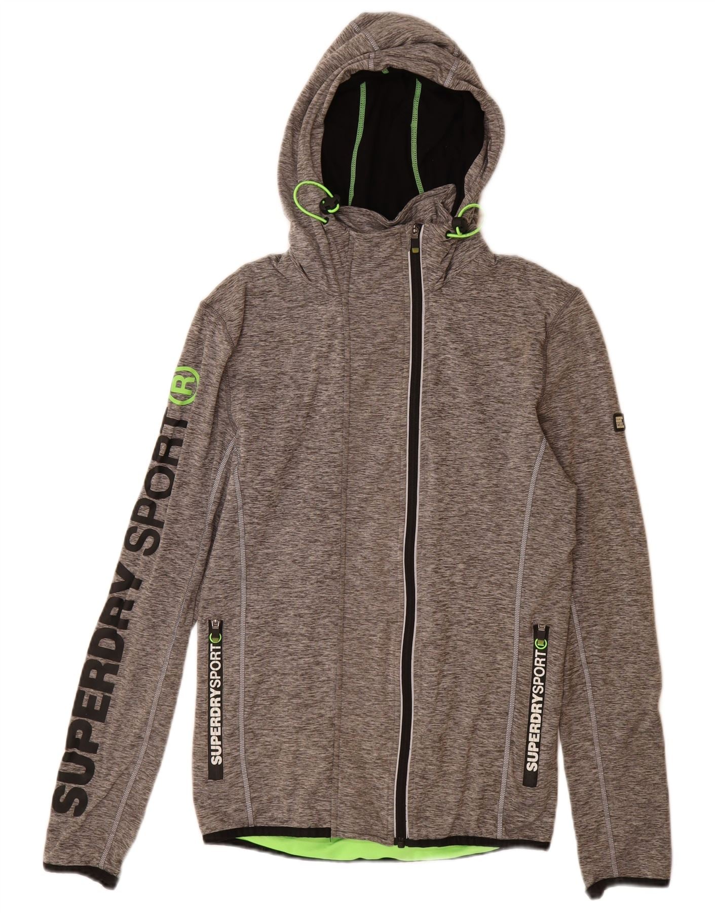 Suéter feminino SUPERDRY com capuz e zíper gráfico com ajuste atlético Reino Unido 12 cinza médio
