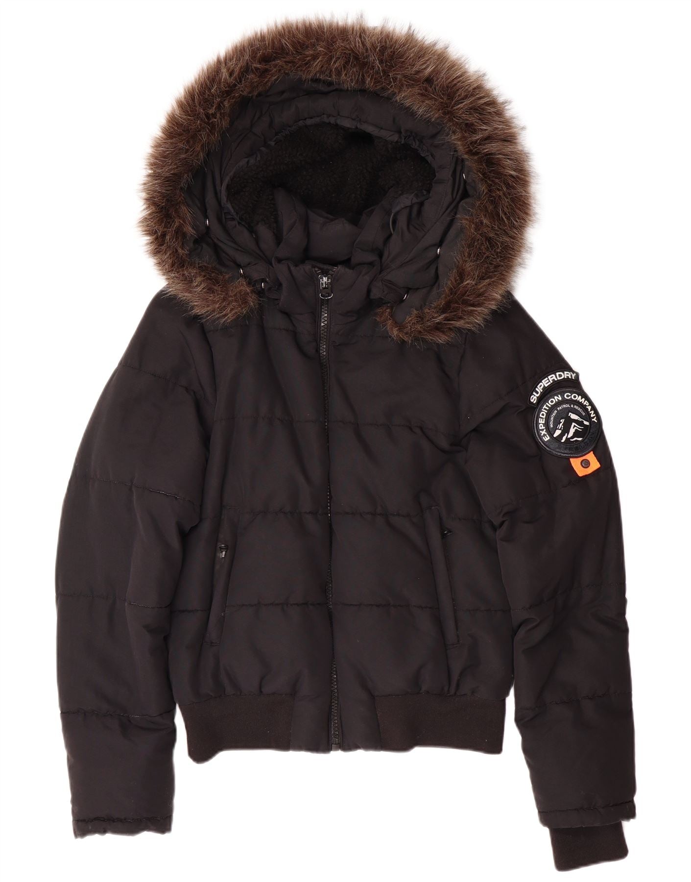 - AI Description: This Superdry womens padded jacket offers warmth and style in black woven polyester. Its thermal design features a high neck and a practical zip closure. The regular fit ensures comfortable layering for winter. Long sleeves and a hooded design with faux fur trim provide extra protection. Zipped pockets add functional detail to this essential winter piece.
