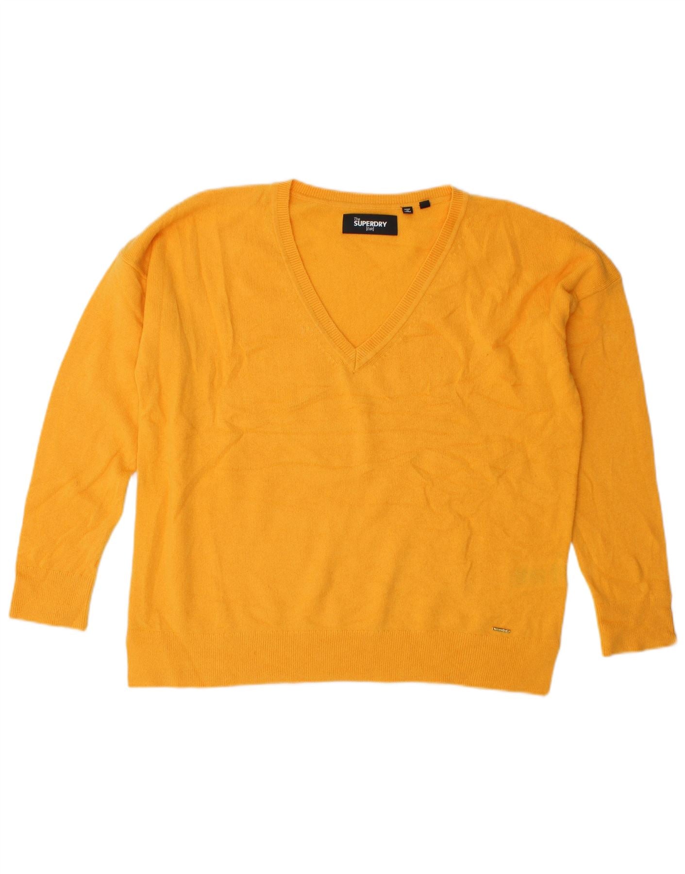 Suéter feminino superdimensionado com decote em V SUPERDRY Reino Unido 10 lã amarela pequena