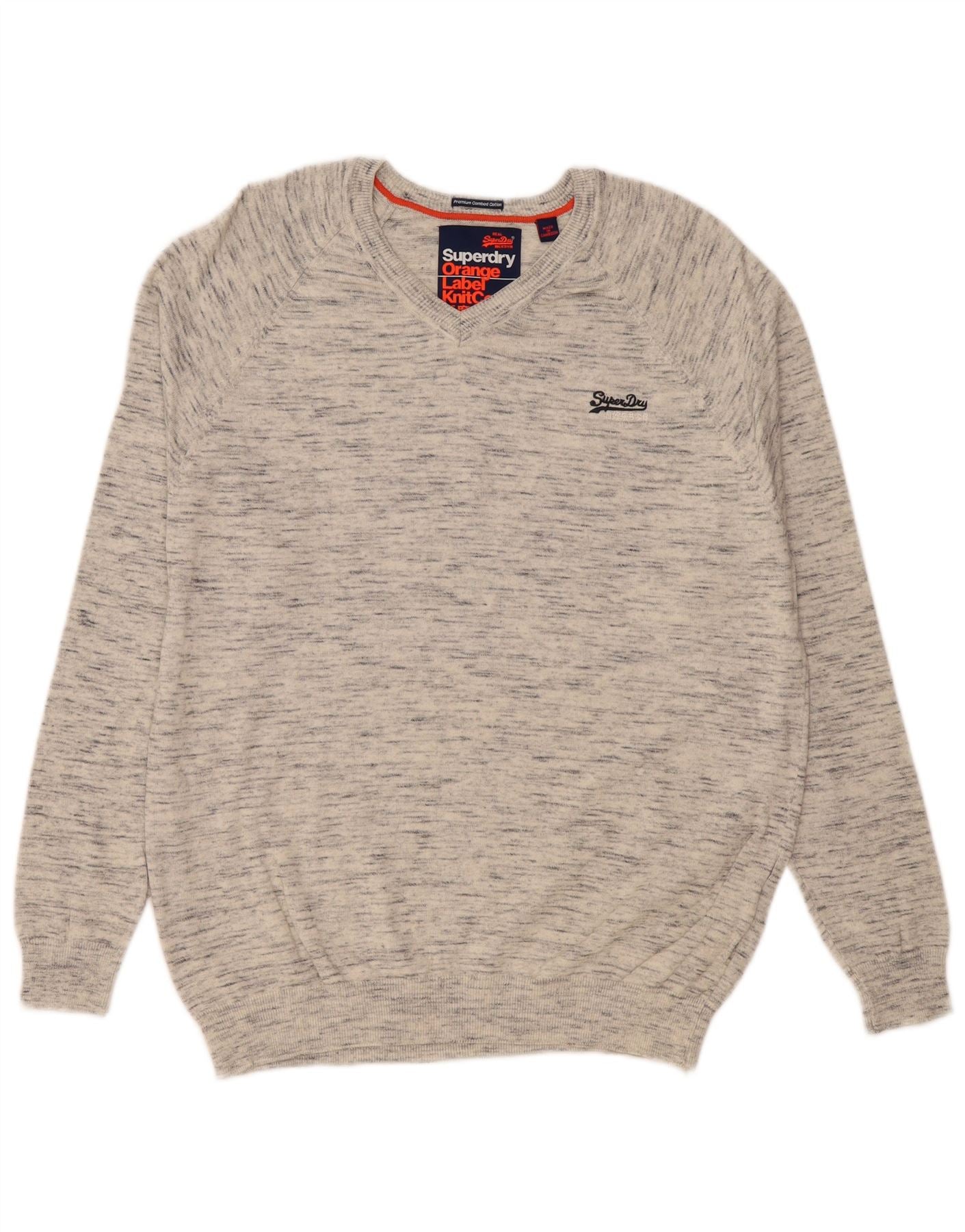 Suéter feminino SUPERDRY com decote em V UK 18 XL algodão manchado cinza